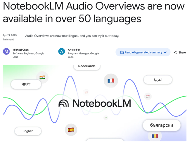 但真正让它出圈的,还是音频概览(Audio Overviews)—— 上传一些文本、网页、视频,Audio Overviews 就能把它们变成一段有主持人、有对话、有互动、有情绪起伏的 AI 播客。 10 个 NotebookLM 用户,恨不得有 9 个人都在使用这个功能。虽说是神器,很多国内用户抱怨听不了中文也是白搭。等了大半年,Audio Overviews 终于支持超过 50 种语言,包括中文。