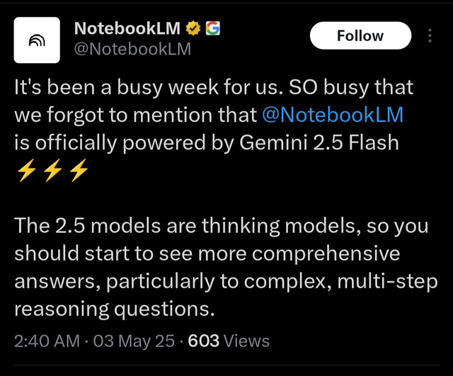 作为谷歌目前最受欢迎的 AI 产品,NotebookLM 底层是谷歌 Gemini 2.5 Flash ( thinking model ),不是最强的 Pro 版本。