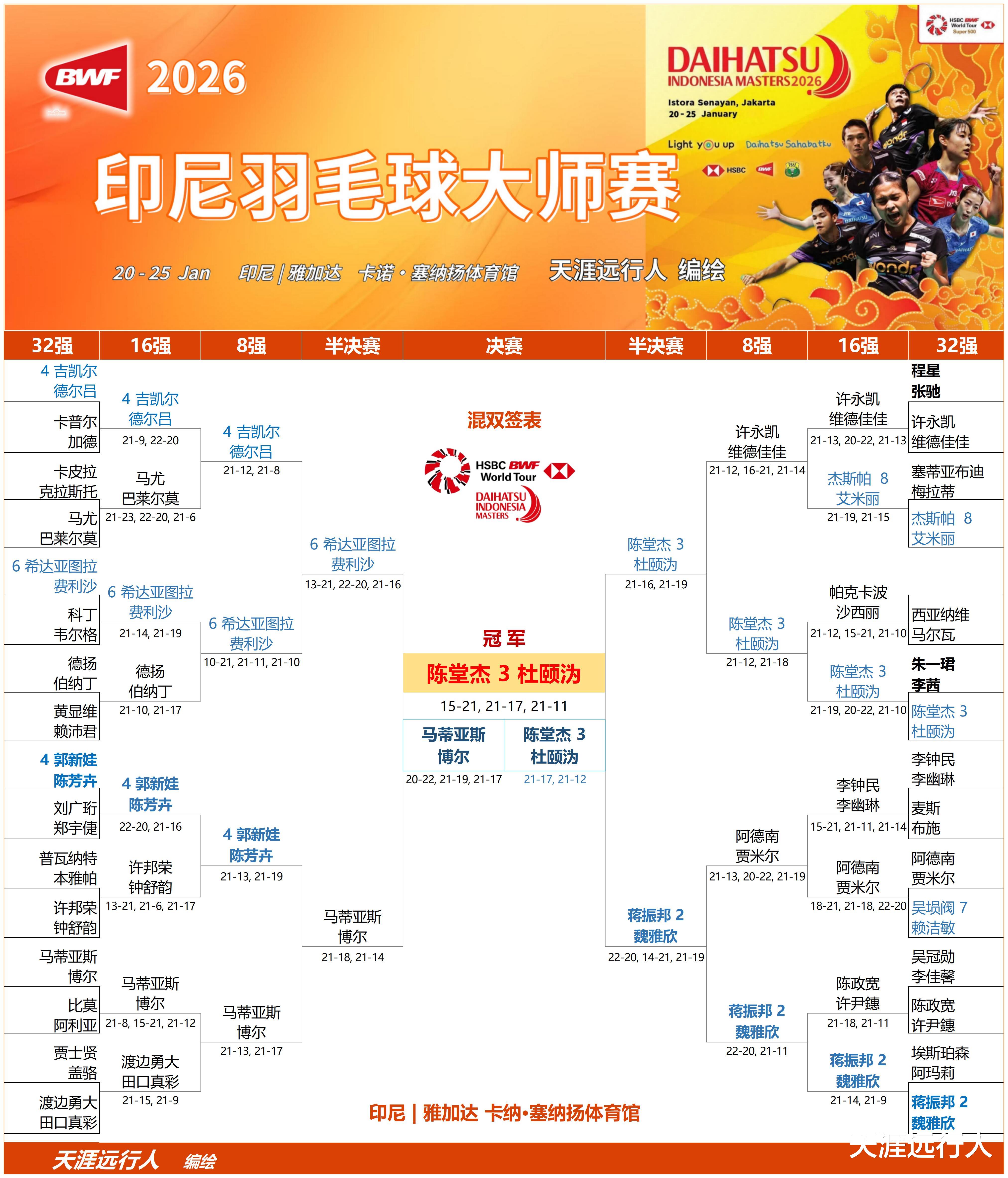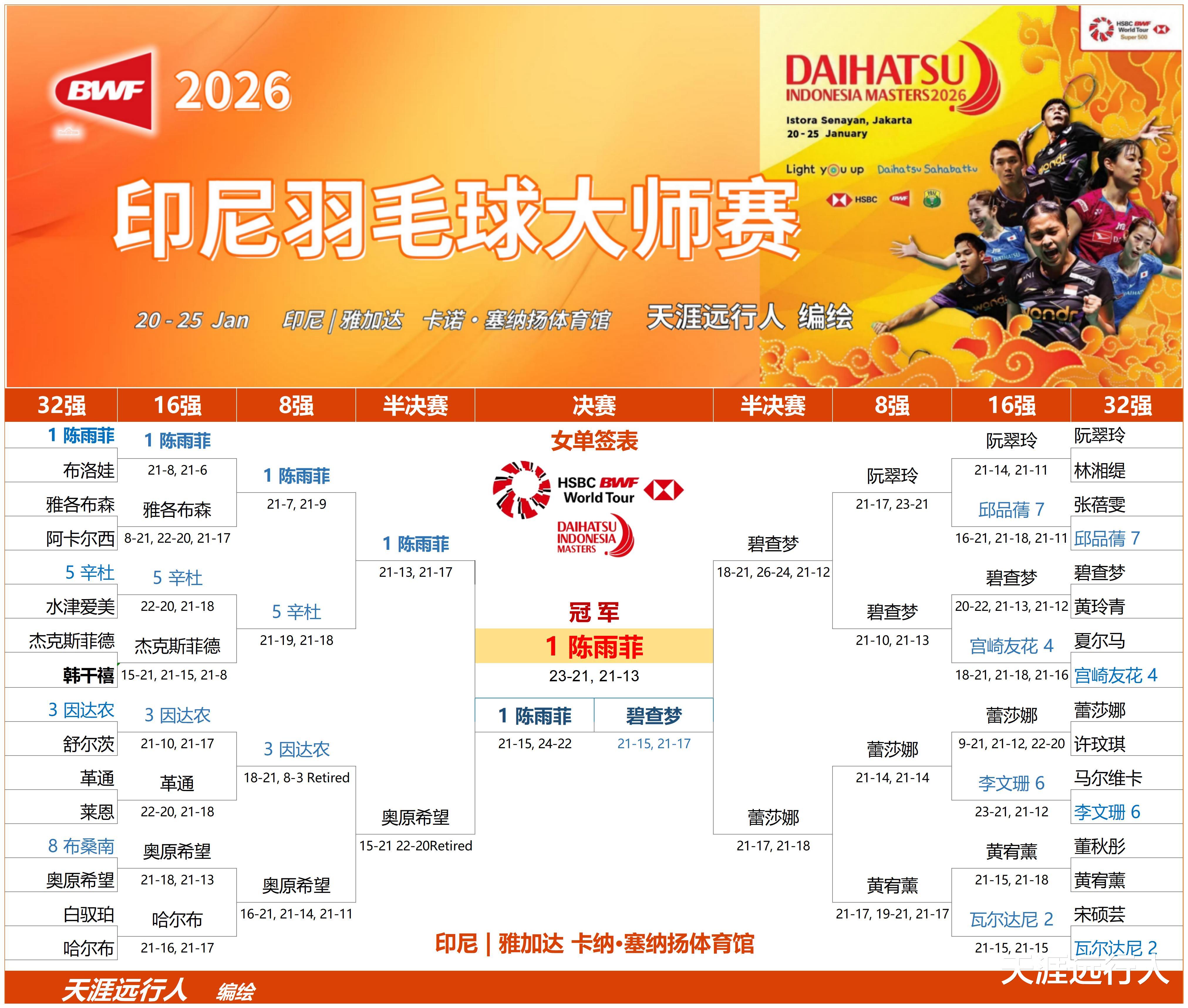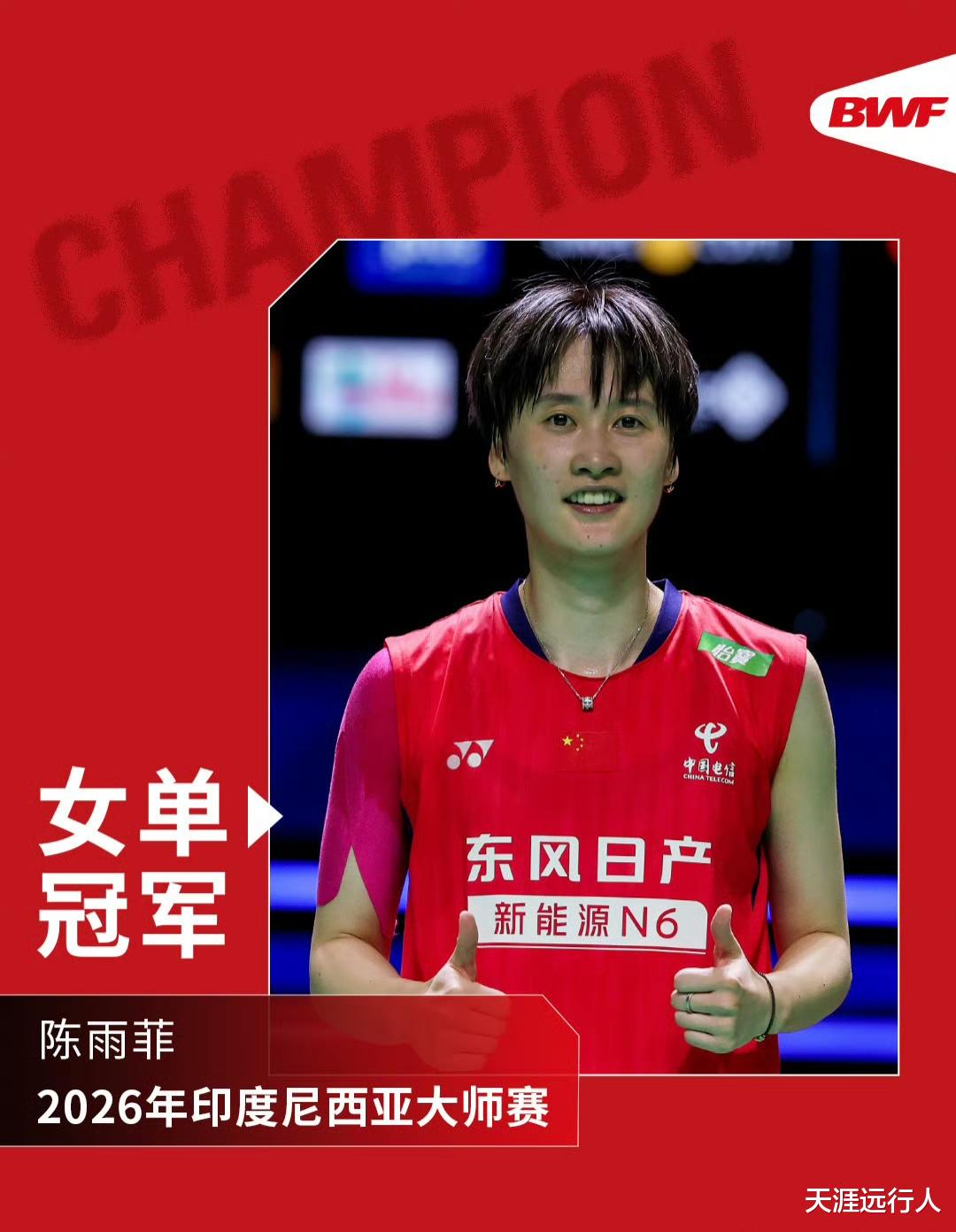北京时间1月25日18时09分,2026世界羽联超级500印尼大师赛收官日,五个单项中的四场角逐,全部决出了胜负,四项冠军各归其主,国羽的荣耀担当、咱们全村人的希望陈雨菲力胜泰国小将碧查梦,夺得女单冠军;女双日本组合退赛,大马球员不战而胜。