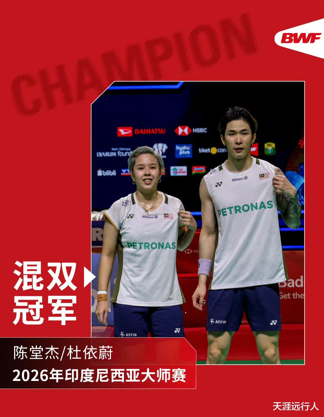 新科世锦赛冠军、马来西亚组合陈堂杰/杜颐沩,以15-21, 21-17, 21-11,让一追二,逆转拿下丹麦马蒂亚斯/博尔,为2025中国澳门公开赛的失利复仇,收获本赛季混双首冠,这也是这对组合职业生涯合作以来的第5个世界羽联超级巡回赛的混双冠军。