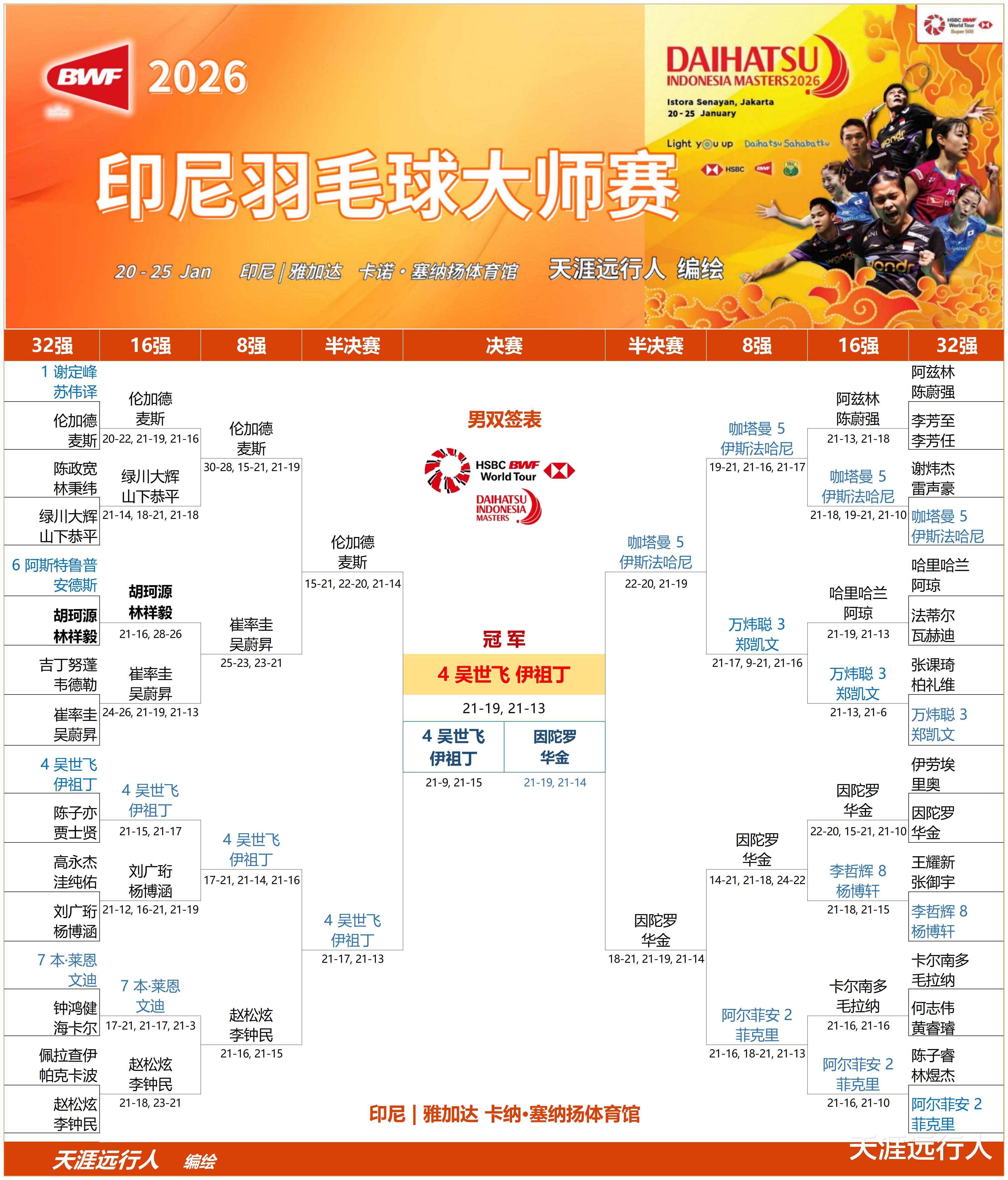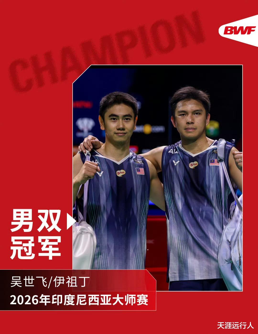 吴世飞/伊祖丁21-19, 21-13战胜因陀罗/华金,为去年澳大利亚公开赛的失利完成复仇,获得本次男双冠军,收获本赛季男双首冠,也是职业生涯合作以来第9个羽联巡回赛男双冠军,打破时隔12个月的冠军荒。