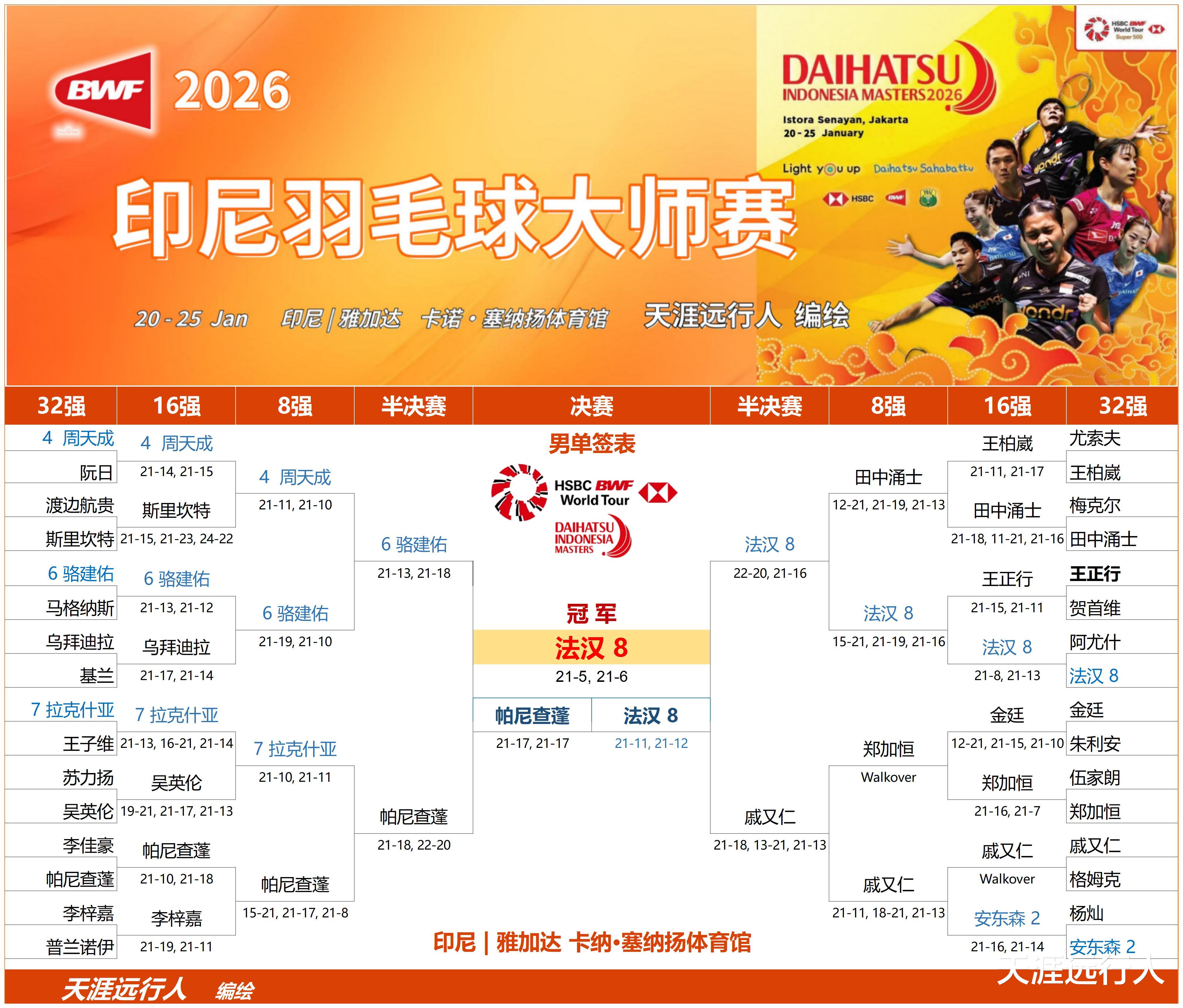 东道主小将法汉,以21-5, 21-6,耗时25分钟,轻松横扫泰国球员帕尼查蓬,收获双方交手的两连胜,夺得生涯首座超级500冠军,揽获本赛季首冠,这也是印尼小将继2024年印尼100大师赛Ⅱ,2025中国澳门公开赛(超级300)之后,第三个世界羽联巡回赛男单冠军。