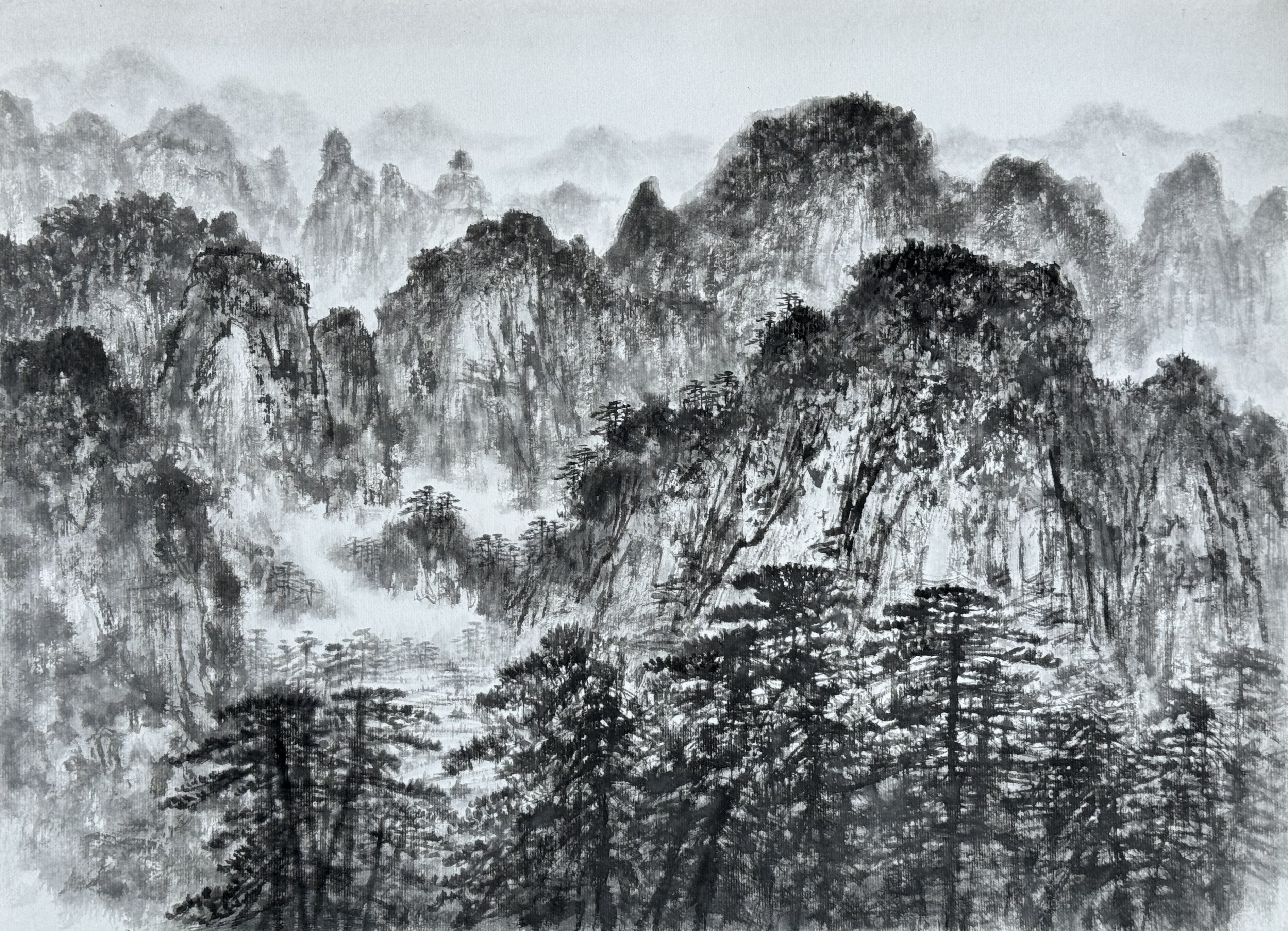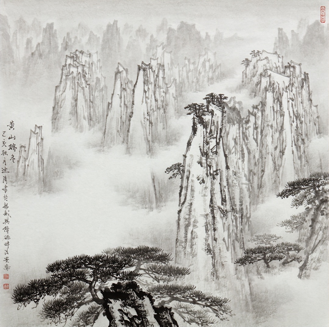 《黄山瑞冬》的山脉以淡墨和浅线勾勒而成,山脉的造型作了相对抽象化和几何化的处理,左下的松树则以浓墨绘出,它和淡墨勾勒的山脉以及右面偏上的松树形成鲜明的虚实对比,白雪和云雾则仍以留白一带而过,尽显黄山奇松、怪石、云海、冬雪之美。