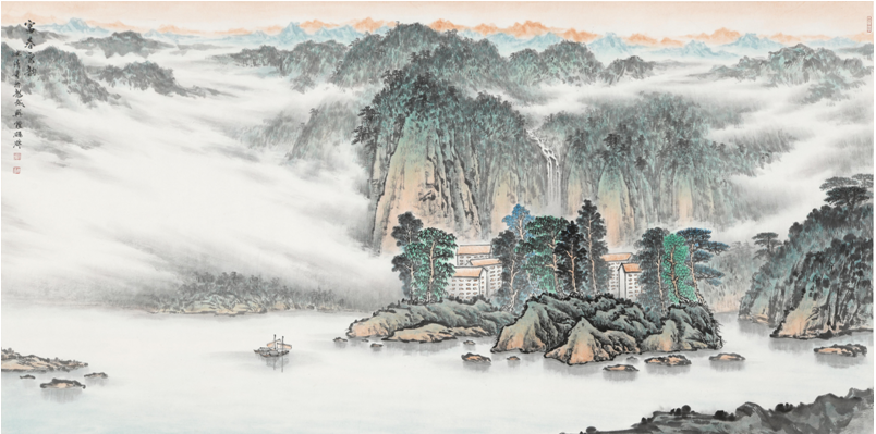 《富春云韵》明显受到了虞山派的影响,它使观者自然联想到黄公望名作《富春山居图》,作者似乎也是有意临仿黄子久这幅被誉为“画中兰亭”美称的佳作之笔意。迪清贤弟以苍厚灵动的笔墨和淡雅的青绿设色描绘了富春江的优美风景,山林叠嶂,青翠欲滴,云气渺渺,若隐若现,云水一色,彼此呼应。两只小舟停泊于江上,给人以平远辽阔、静谧幽长、飘逸清雅的意境。该画虽然借用了元人的笔墨情调,但是参差栉比的楼房透露出当代气息,山林开合有序,以大面积留白描画的云气和江水升腾弥漫,寂静的山林与流动的云水形成动静对比,充满禅境和诗意。该画景色优美,笔法老练,用墨讲究,设色淡雅,山水左简右丰,疏密得当,静中有动,墨色浓淡干湿并用,笔法极富于变化。