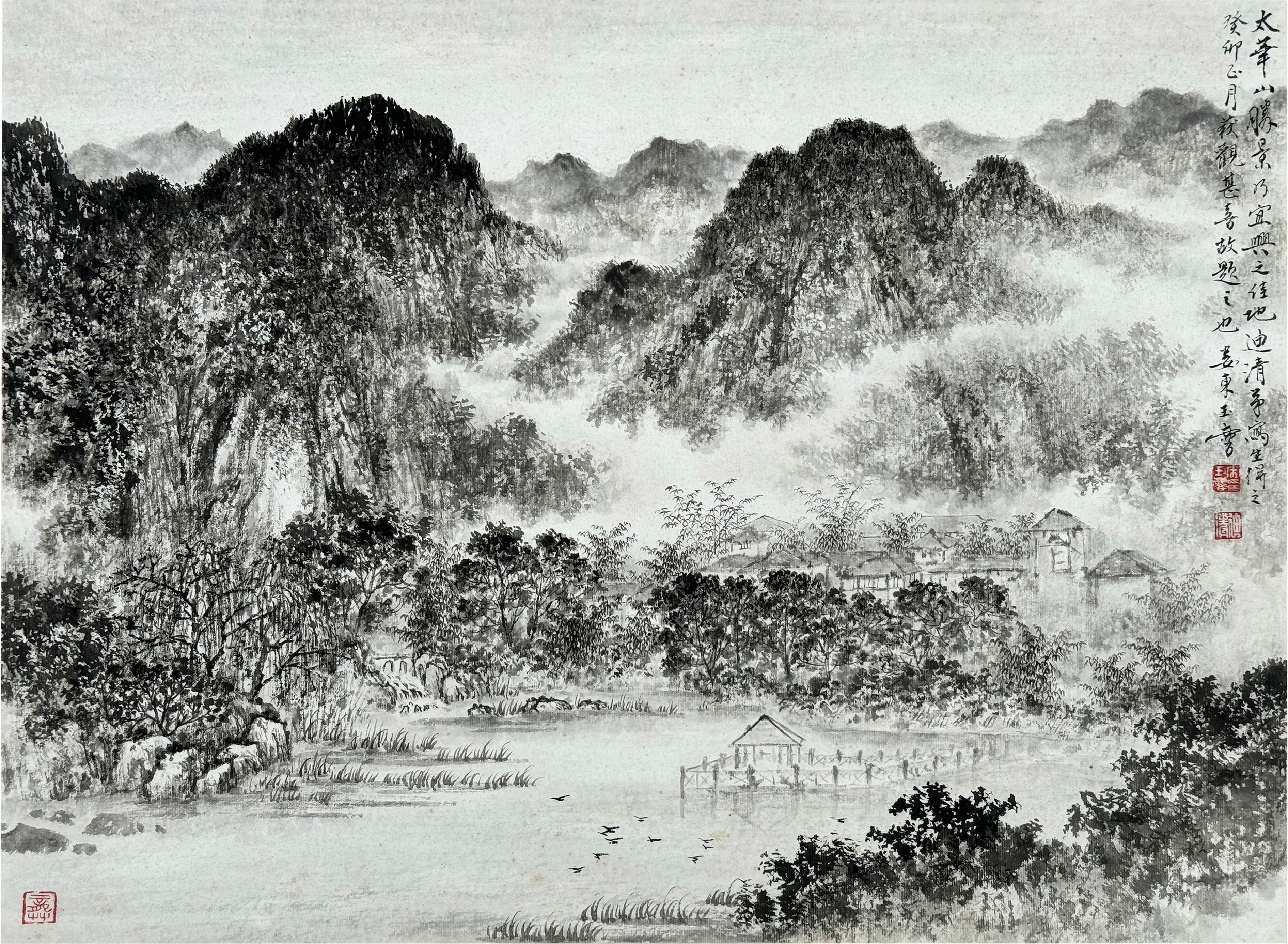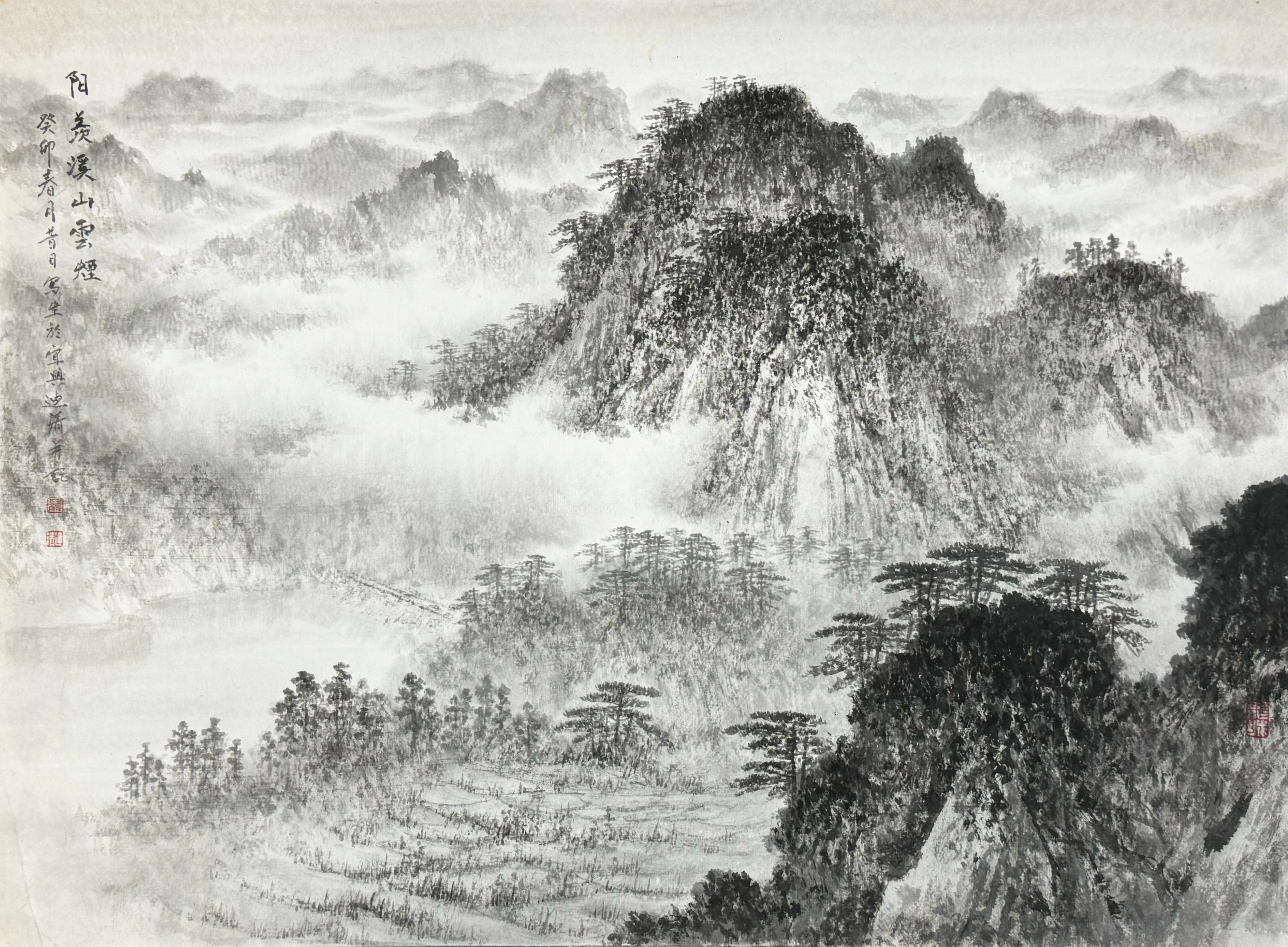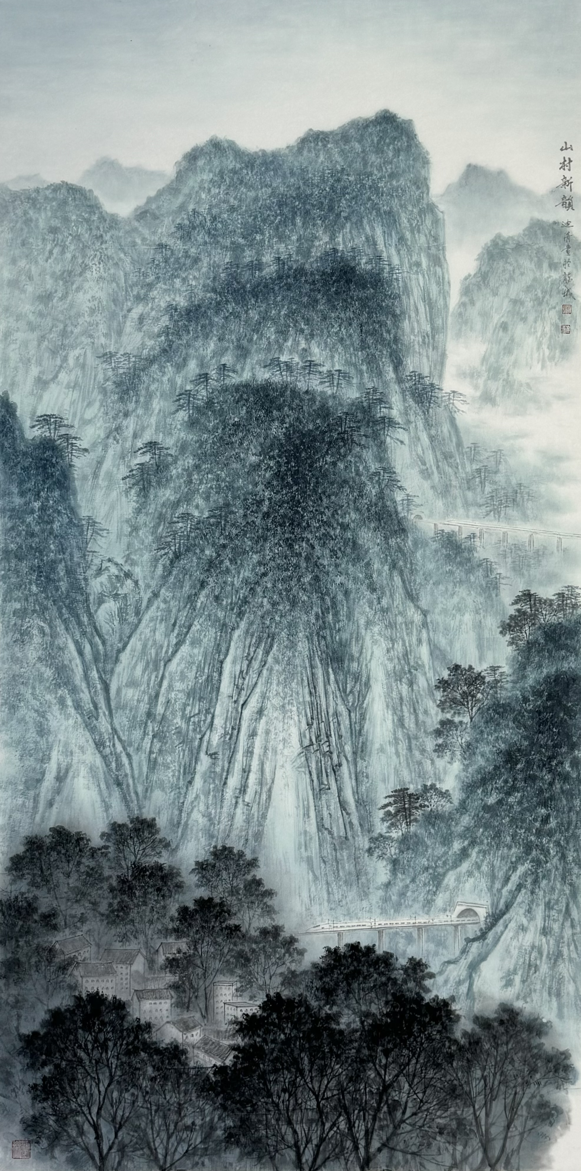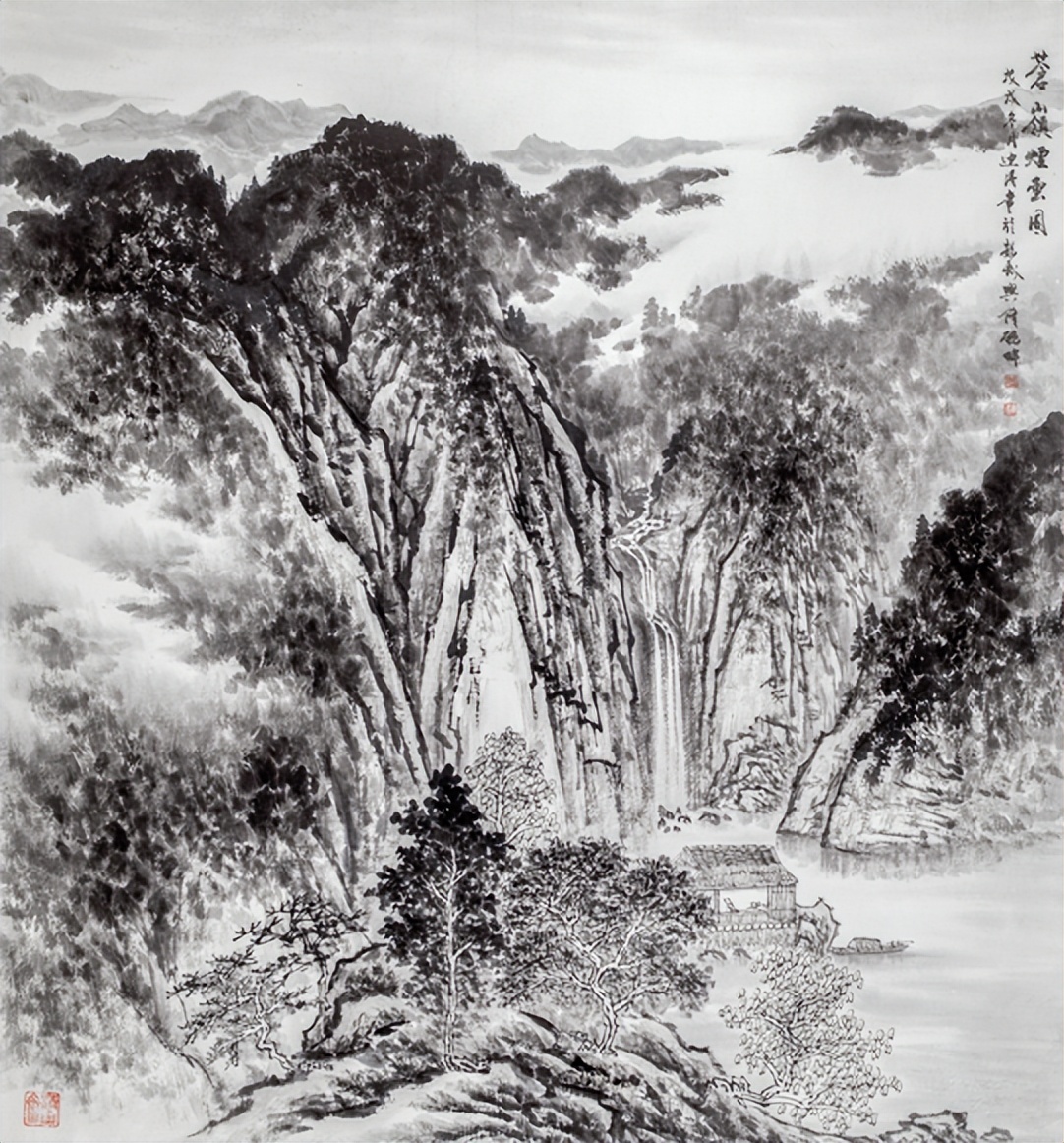 《苍岭烟云》为纯水墨山水,其仍然继承元画和虞山画派的精髓,用笔爽利,施墨雄厚,皴擦点染之中尽显磅礴元气。所绘山脉高峻浑深,层次分明,主辅有序,所画林木沉郁坚凝,郁郁葱葱,一派生机盎然之境,一座房舍(内有一位文士坐于书桌前)和一叶扁舟山脉看似不经意的点景之作,但是具有丰富画面内涵,避免艺术语言单一的深意。山脉、林木、房舍、小舟均为静态之象,而山间瀑布则淙淙而流,蜿蜒而下,呈现独特的动态之美。烟云仍以留白绘出,朦胧散淡,渺远涌动,气韵升腾。更为有趣的是房舍内的文士的造型作了抽象化的处理,画面右中和右下角的夹叶树也作了几何化和简约化的描绘,只此两点,就使该画具备了当代性。此作给我的感觉是更似北派山水之姿,以阳刚和雄强为主元,南派山水的秀气与灵动则处于次要地位。