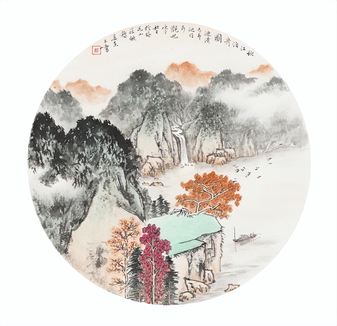 《秋江泊舟图》明显借鉴了新金陵画派的精粹,用笔散淡,施墨放逸,浓淡有致,设色明快,色墨交融,相得益彰,远山与近山虚实相生,山林、小舟与飞掠的大雁动静并济,一片澄明华艳之境油然而生。