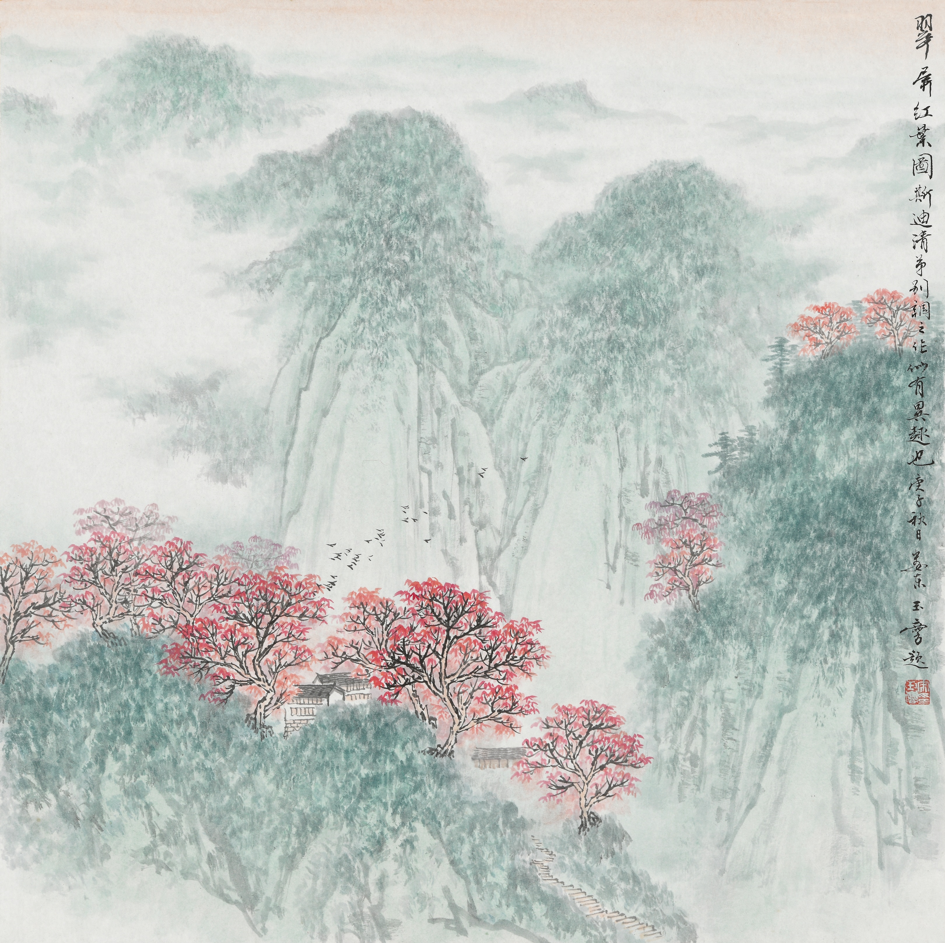 《翠屏红叶图》用笔轻薄,施墨朦胧,颇似西画的亚光效果,设色恬淡雅致,青绿和胭脂两色形成微妙的变化,云霭弥漫山林之中,大有迷雾锁青山之势,一群大雁横空飞过,与幽静的山林、房舍构成动静对比,具有一种若隐若现、清丽婉约之美。