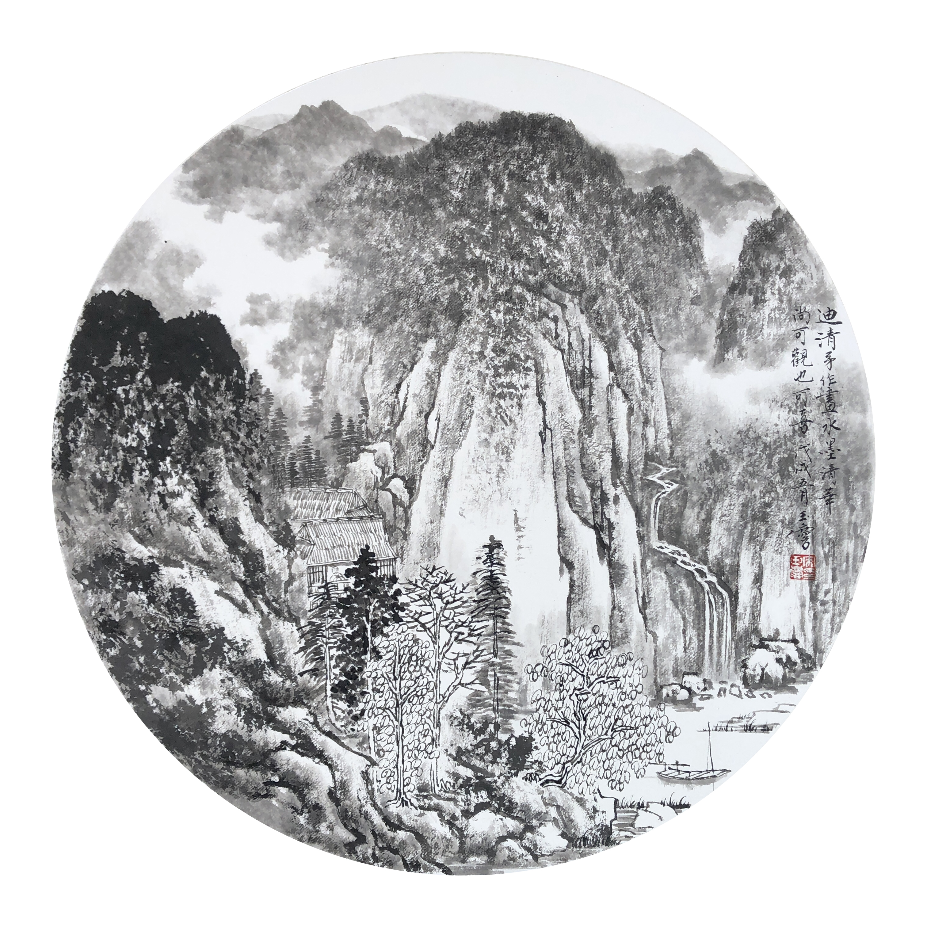 《水墨山居图》以传统的团扇形式绘制而成,属于纯水墨作品。该画长线居多,用笔苍劲,皴擦得法,施墨润泽,山体浑峻,林木茂盛,溪水潺潺,中下的夹叶树、右下的小舟和左上的房舍中的人物采用简约化、抽象化处理,给观者以清新自然的美感。