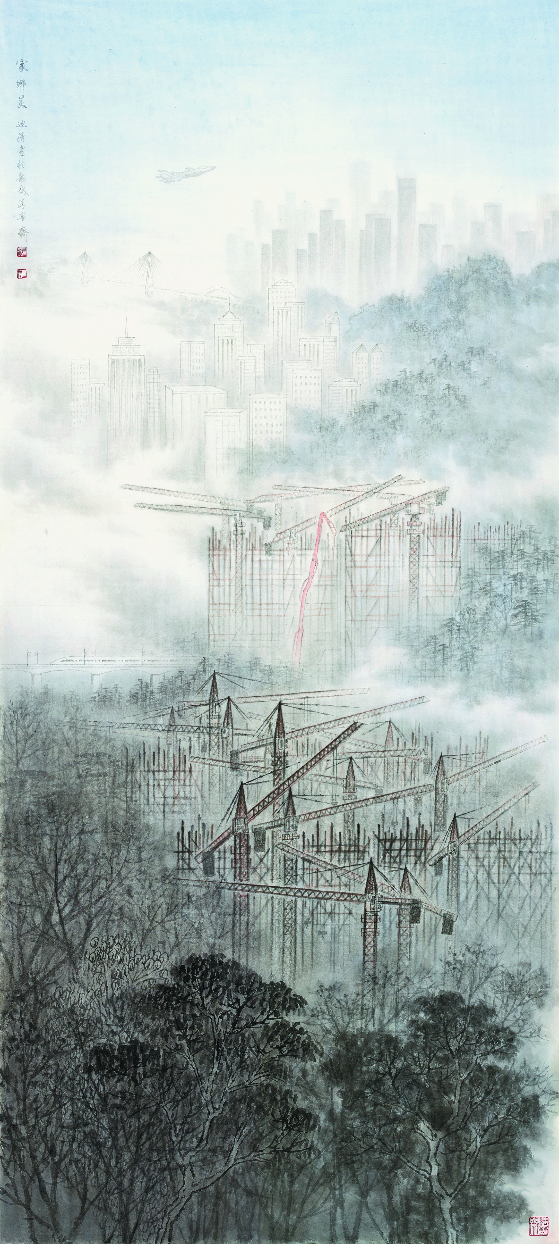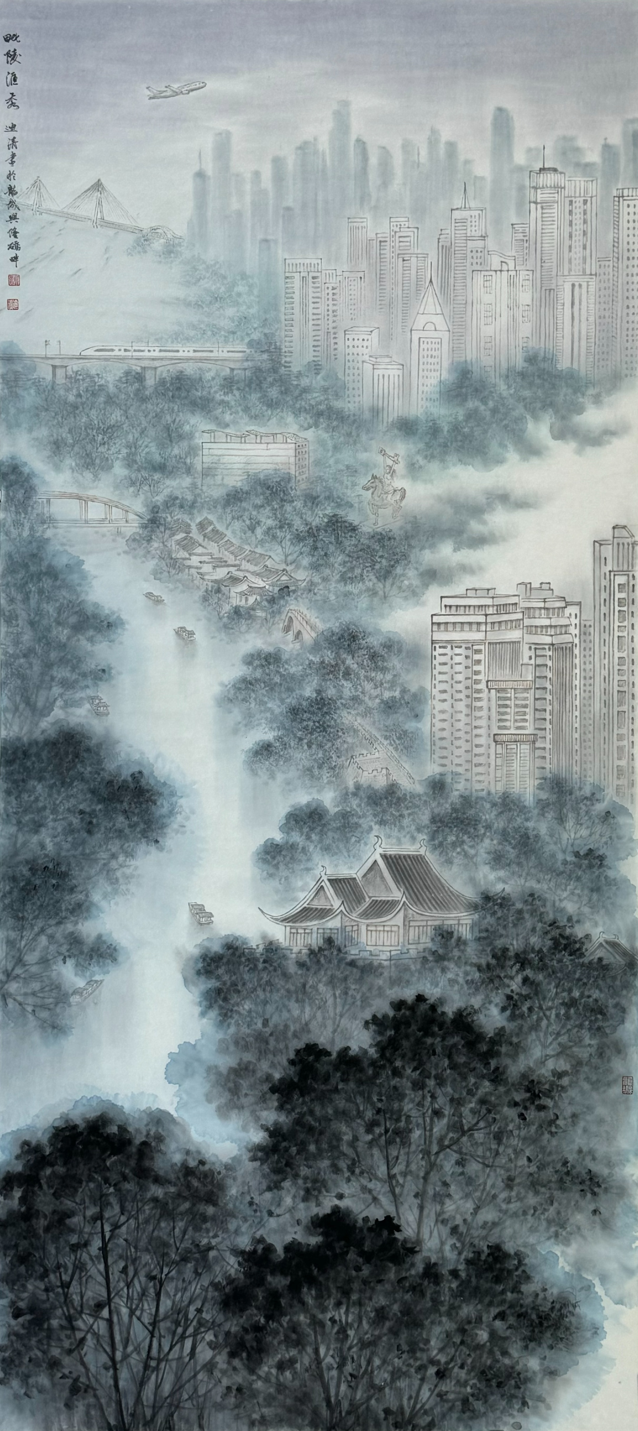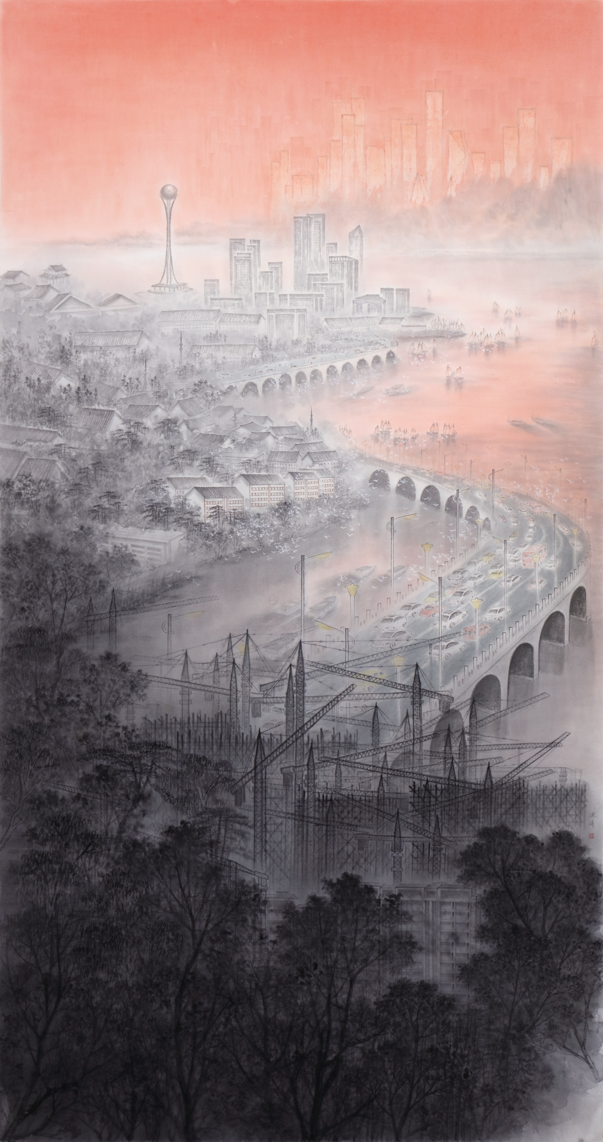 笔墨当随时代,近年来迪清多以本土家乡的人文景观为创作题材,着力弘扬当代性与现代感,以此反映时代发展新貌,《醉美龙城》即为明证。在该幅作品中,作者将西画中的“光”元素引入山水画之中,尤其是鳞次栉比的楼房采用焦点透视加以描绘,尽显立体之感,它们在朝霞的映衬下更具华兹明媚的意境,近景中的林木浓淡相宜,一派幽静平和之气,树木掩映下的房舍、桥梁与远方的楼宇形成微妙的呼应,作者将中西与古今有机合璧,以昭显着力实现中国山水画当代化的决心与果敢,这的确气度非凡、令人敬仰。画家以自己的卓越艺术实践,诠释了新金陵画派所倡导的“自觉的创新意识”,从而书写了中国山水画的当代风采。