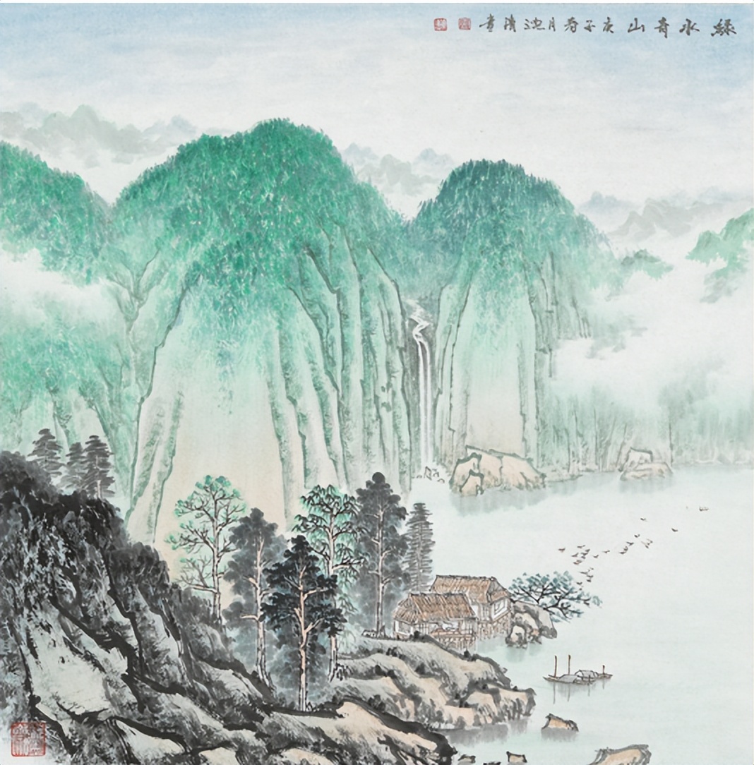 《绿水青山》政治主题鲜明,属于主旋律作品,它将青绿与水墨完美合璧,远山青翠迤逦,华兹澄明,浅雅淡泊,近山笔墨厚重沉雄,苍劲爽利,二者形成虚实对比,静谧的山林、房舍、小舟与流溢的云气、瀑布以及展翅的大雁形成动静对比,方寸之间的小品虚实相间、动静并济,被作者演绎得淋漓尽致、美轮美奂。
