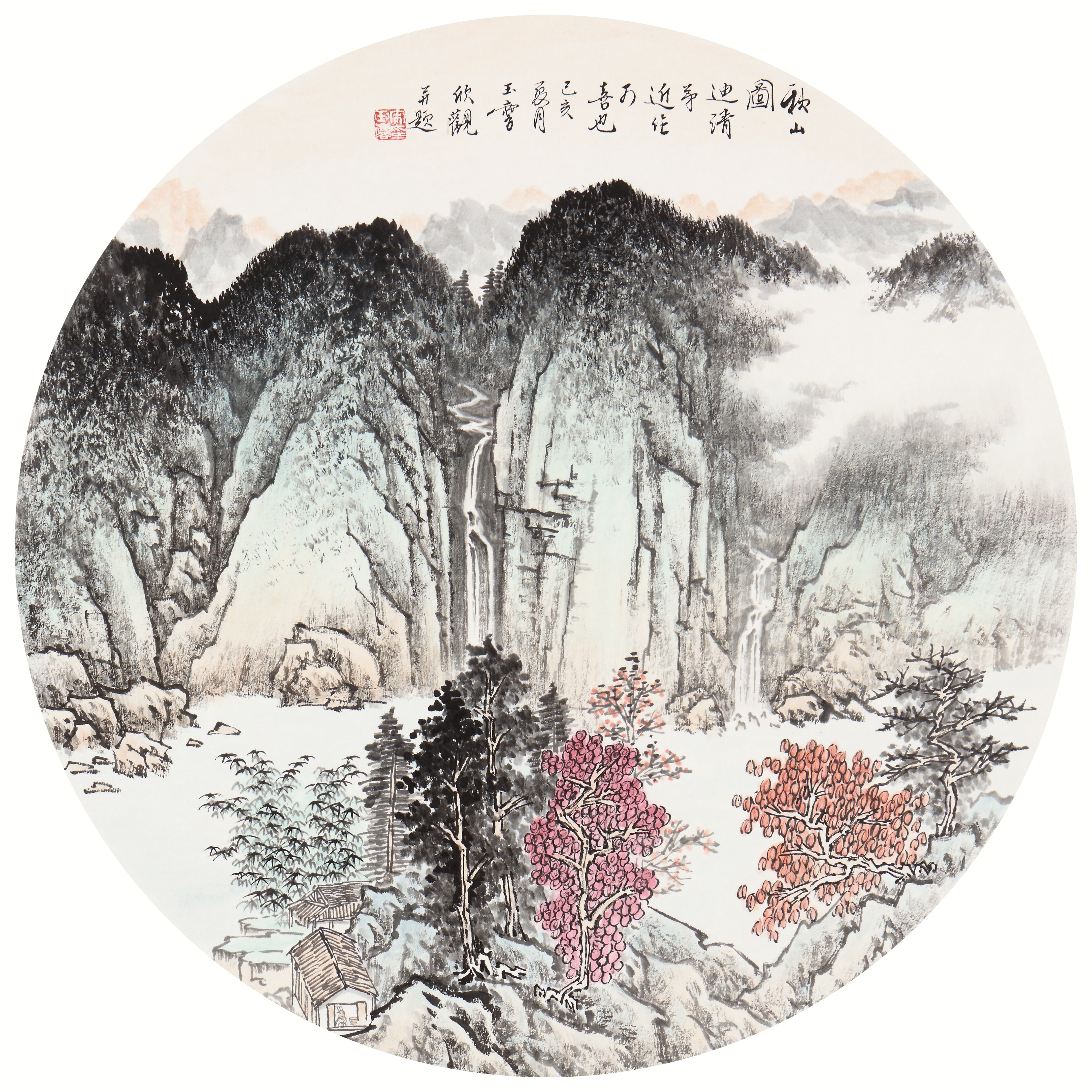 《秋山图》仍沿采用传统团扇形式,在总体上看属于南派山水,用笔放逸,施墨润泽,设色清雅,山脉的勾勒采用了类似西画中的轮廓线,幽深而闲静,林木浓淡相间,色墨交融,与静态的山林、房舍与两条蜿蜒而下的溪水构成动静对比,朦胧简括的远山和浑深的近山形成虚实对比,房舍中的文士与夹叶树仍然采用简约化、抽象化手法加以描绘,逸笔草草之中尽显生动的气韵与浓烈的文人趣味,给人以澄明雅寂、秀润明丽之美感。