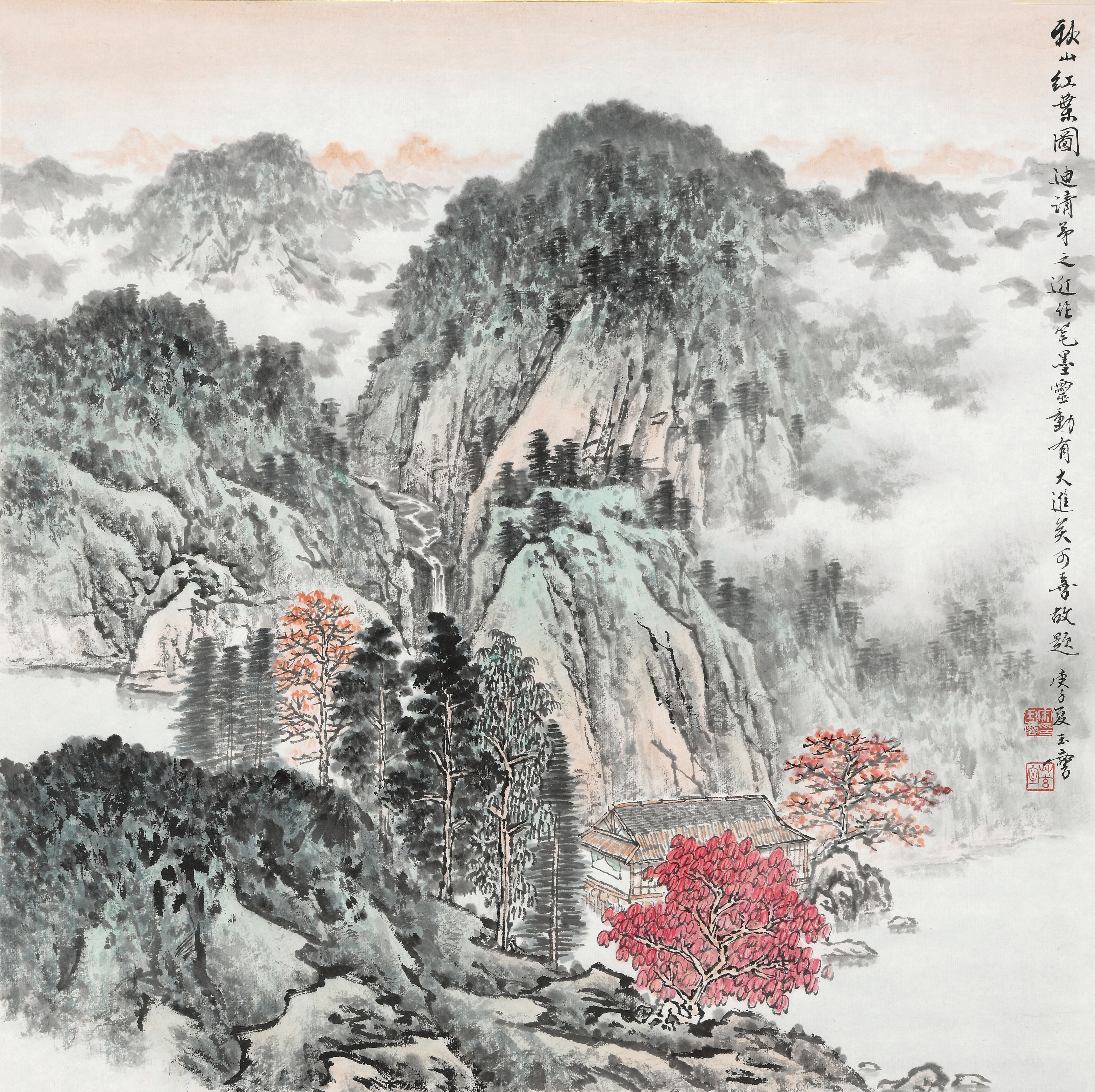 《秋山红叶图》将元人的笔墨和新金陵的意境合二为一,山脉浑厚幽深,林木洒脱俊逸,云气飞腾涌动,虽名为“秋山红叶图”,但是作者避开了“层林尽染”的俗境,“红叶”并非主角,它只是起到陪衬与点景作用,山脉林木才是作品的中心,区区的斗方作品立意却不落常规,该作虚实相济,色墨并举,动静有序,给人以耳目一新的美感。