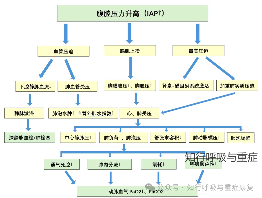 腹腔内压可通过血管压迫、促使膈肌上抬、器官压迫三种途径作用于胸腔,导致胸腔内压力显著升高,进而对肺组织产生外源性压迫,最终引发呼吸功能障碍。
