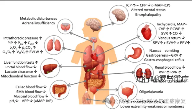 图2 腹内压升高对各个系统的影响(引自2020,Ventilation in patients with intra-abdominal