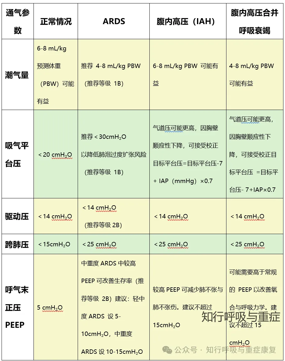 IAH 会升高肺泡闭合压,需更高 PEEP 防止呼气末肺泡塌陷;但过高 PEEP 会增加胸腔压力,降低静脉回流,甚至进一步升高 IAP(尤其在腹内顺应性差的患者中)。因此,PEEP 需个体化滴定,无统一 “最佳值”。在公众号前文已有基于需个体化滴定的方法整理,大家可直接点击跳转→第149期 滴定PEEP的9个方法
