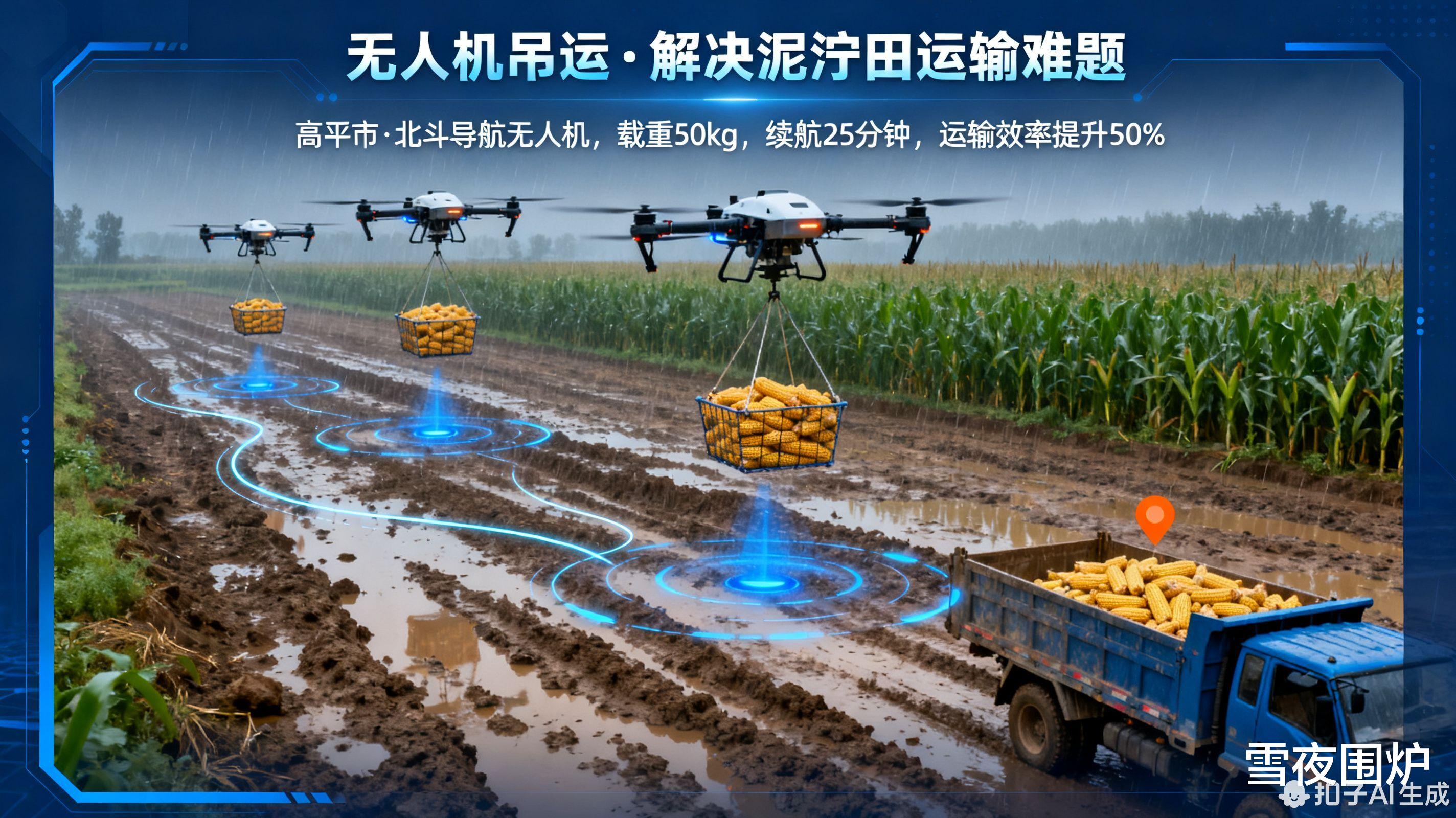 高平市泥泞田攻关:无人机吊运替代人工搬运,单机每小时运送玉米3000斤,解决雨后农机无法下地难题。