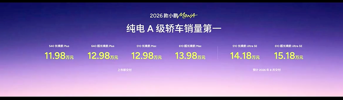 4月2日,2026款小鹏MONA M03正式上市,售价区间11.98万-15.18万元,共推出6款配置车型。要知道2025年该车的全年销量超过17.5万辆,占小鹏集团总销量的46%,可以说它是小鹏汽车的支柱也不为过。在此背景下,它的重要性绝对不是小鹏G7、小鹏P7等车型可比拟的。也正是如此,新车可以说是 “加量不加价”。那么新车的六款配置之间又该如何选择?别急,今天就为大家好好盘一下这款车。