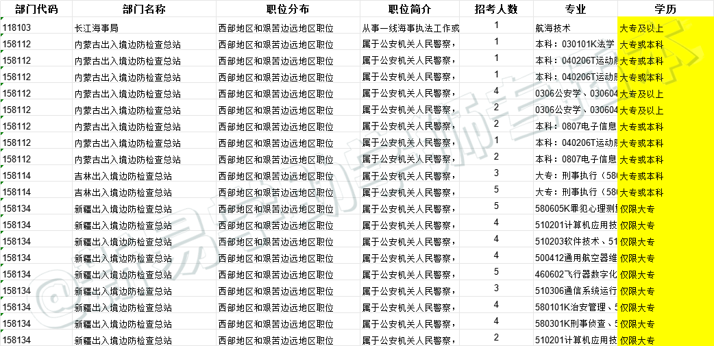 今年的招录情况和去年相差不大,专科生能报考的岗位仅有20个,招录人数共计58人(去年是 21 个岗位/52 人)。值得注意的是,这些岗位均为西部地区和艰苦边远地区职位,广东无专科生可报岗位。