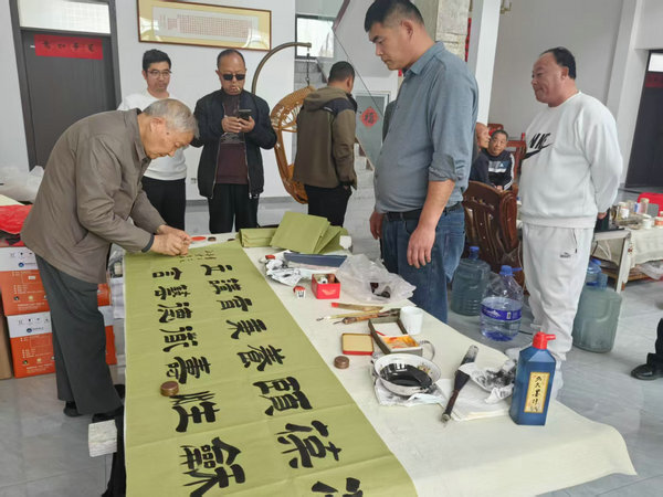 “书法技巧主要在于笔法、字法、章法等几个方面。比如笔法,我们有中锋运笔、侧锋运笔、提按、转折等。而转折又分为圆转和方转。比如这个字,就是方转,笔锋在转折处有明显的折角,线条刚劲有力……”叶智平先生在书写作品的同时,现场为书法爱好者传授笔法技巧。从下午一点开始,叶智平先生连续书写了五个小时,共为书画爱好者书写了60多幅作品。村民们手持笔墨未干的书法作品,满心欢喜。一位村民激动地说道:“叶智平先生是著名书法家,平常想见一面都难,没想到今天我竟然能求得叶智平先生的一幅字。”