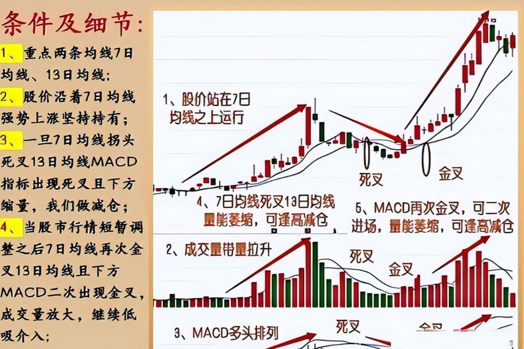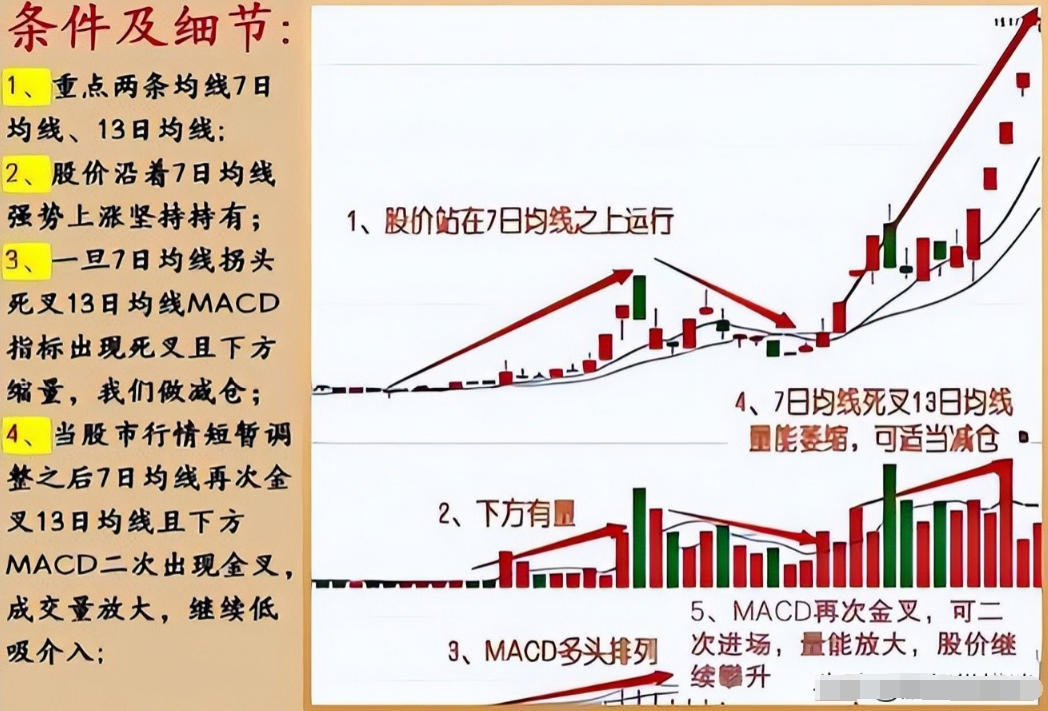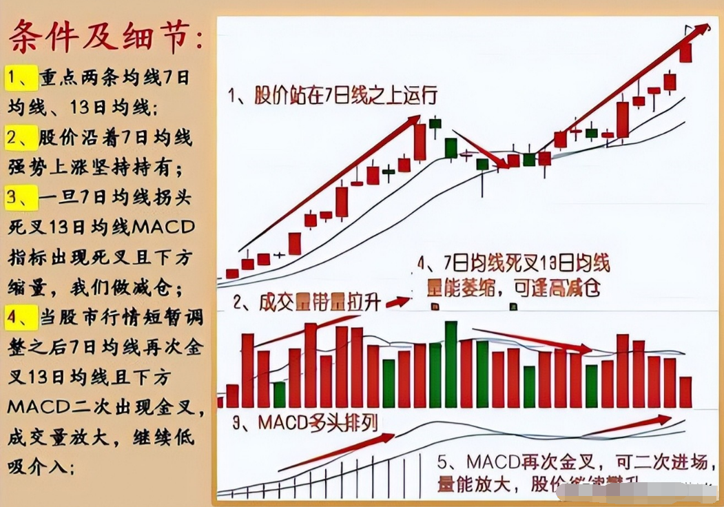 股价在回升趋势初期,小周期线金叉13天线,则是初次的介入点。此时,在回升趋势中会温和的放量,7日线在13日线上方,构成双双齐飞态势,此时就是波动持有。在回升途中,7日线逐步拐头向下,死叉13天线,量能开端萎缩,就要逢高减仓了,这是因为短线开端走弱,初次的上扬已经结束,后面的行情走势则需要配合MACD来帮忙。