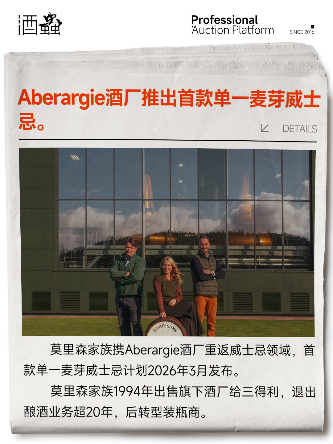 莫里森家族携Aberargie酒厂重返威士忌领域,首款单一麦芽威士忌计划2026年3月发布。