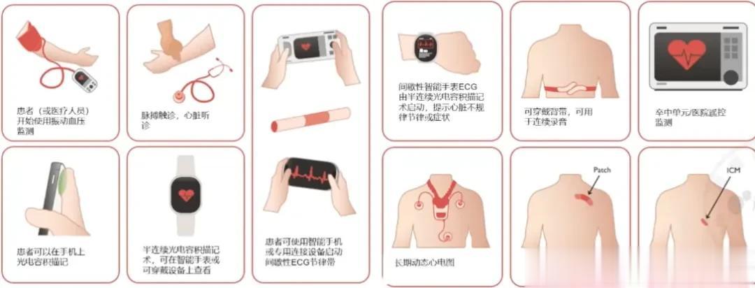 目前的筛查工具包括心电图、动态心电图、可植入电子设备、心脏电生理检查等。目前全球有超过10万个移动健康应用和超过400种可穿戴设备可用于房颤筛查或其他健康目的。
