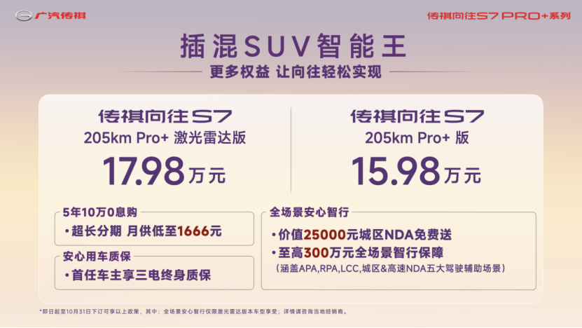 同时,备受关注的传祺向往S7 Pro+系列焕新上市,售价15.98万元起,金融政策:5年10万0息,月供低至1666元,还有价值25000元城区NDA免费送、至高300万元全场景智行保障,首任车主还可享三电终身质保,真正让“向往的生活”触手可及。