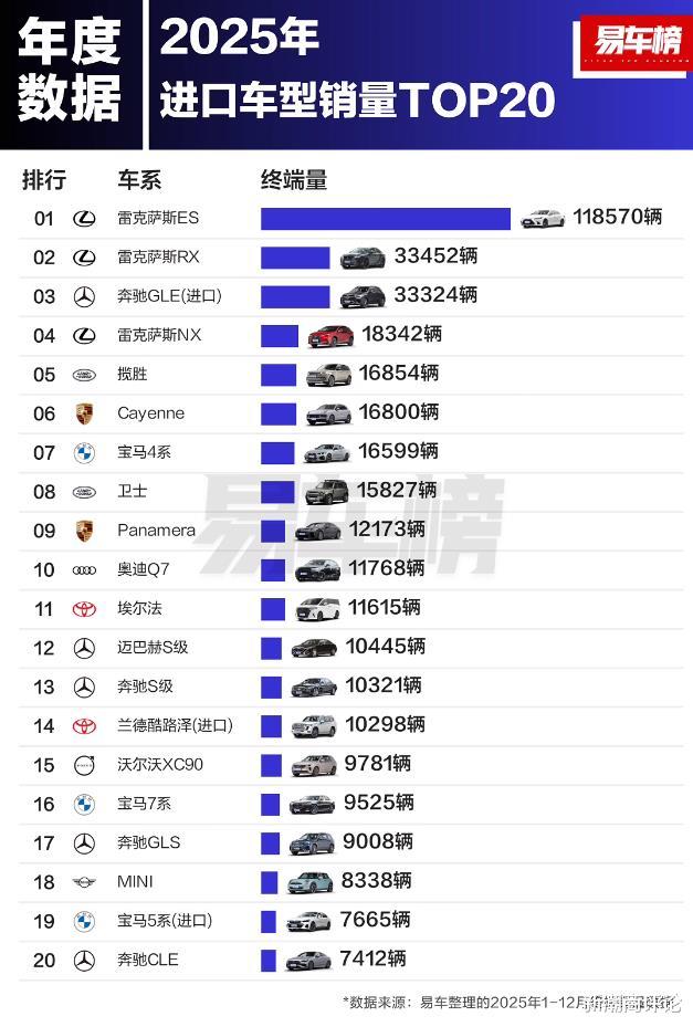 进口车型TOP20合计销量达到38.8万辆,共有14款销量超过1万辆,较2024年减少4款。分品牌来看,奔驰5款,雷克萨斯、宝马各有3款,保时捷、丰田、路虎各有2款,奥迪、沃尔沃、MINI各有1款。