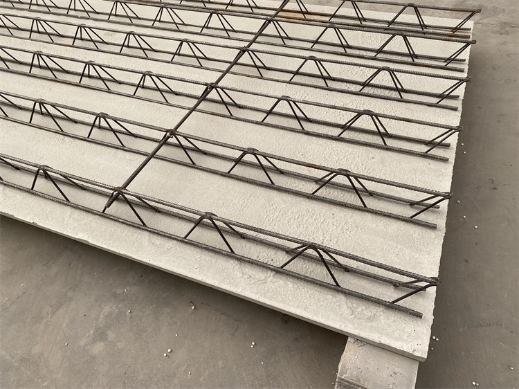 构造:免拆底模钢筋桁架楼承板主要由两部分组成,一部分是混凝土底模(由425水泥、细沙、细石等材料构成的2厘米厚的细石混凝土底模),另一部分是钢筋桁架(底模上预埋6条钢筋桁架和2条腹杆钢筋)