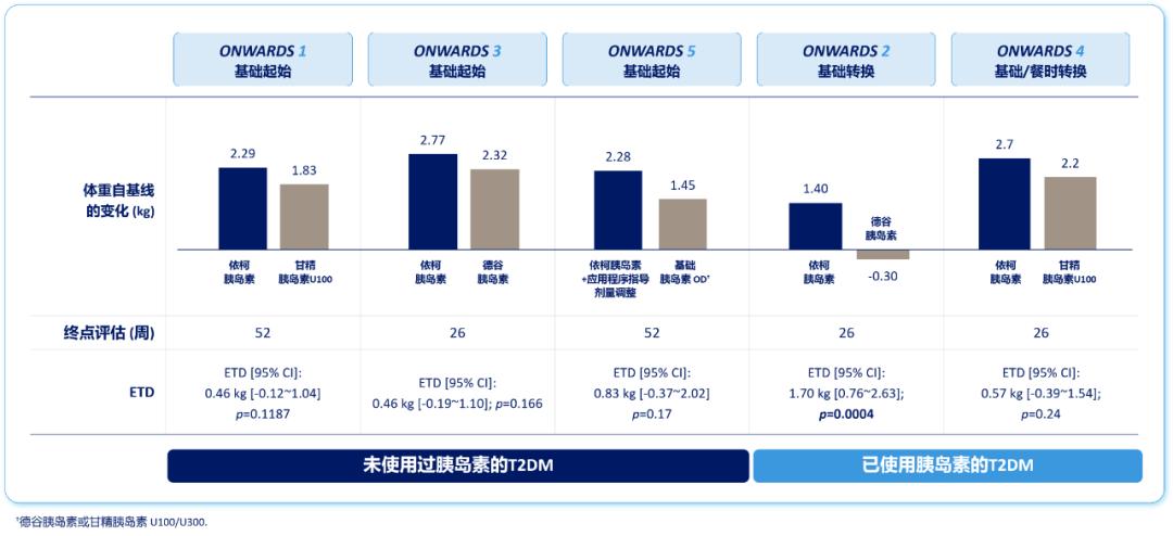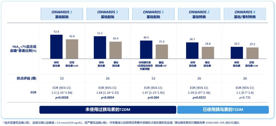 其中,ONWARDS 1、3、5研究评估了未使用过胰岛素治疗的T2DM患者起始依柯胰岛素治疗的疗效和安全性,ONWARDS 2、4研究评估了已使用胰岛素治疗的T2DM患者转换为依柯胰岛素治疗的疗效与安全性。ONWARDS 5研究在随机对照研究中结合了真实世界元素,更贴近真实临床实践。