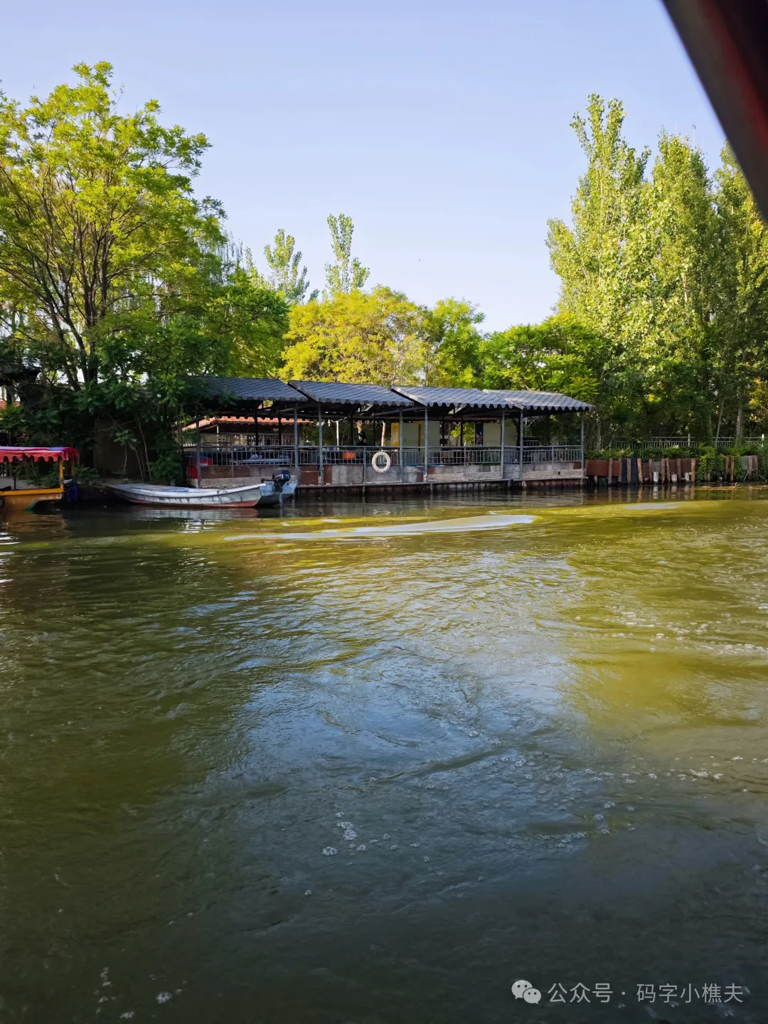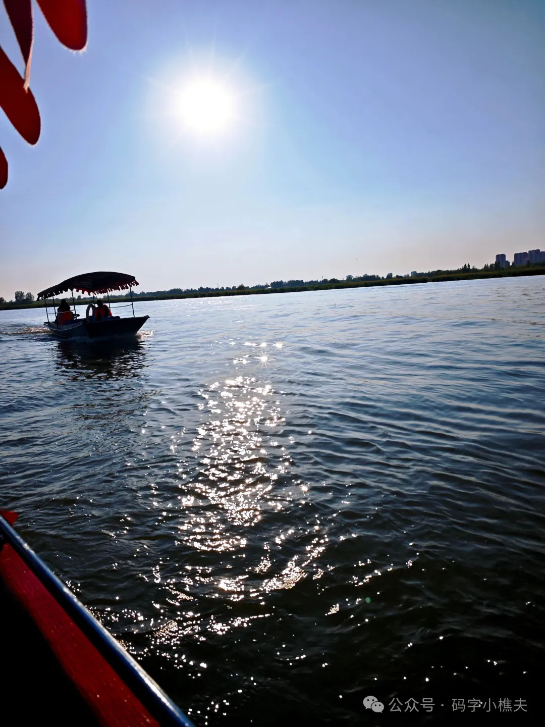 大哥开着船在淀里航行。路上碰到其他经过的船,他们带起的水流打在我们的船底,我们的贼船晃动地很厉害,7岁的格雷虽然害怕,却也觉得挺刺激,旅游的小船可别说翻就翻啊。