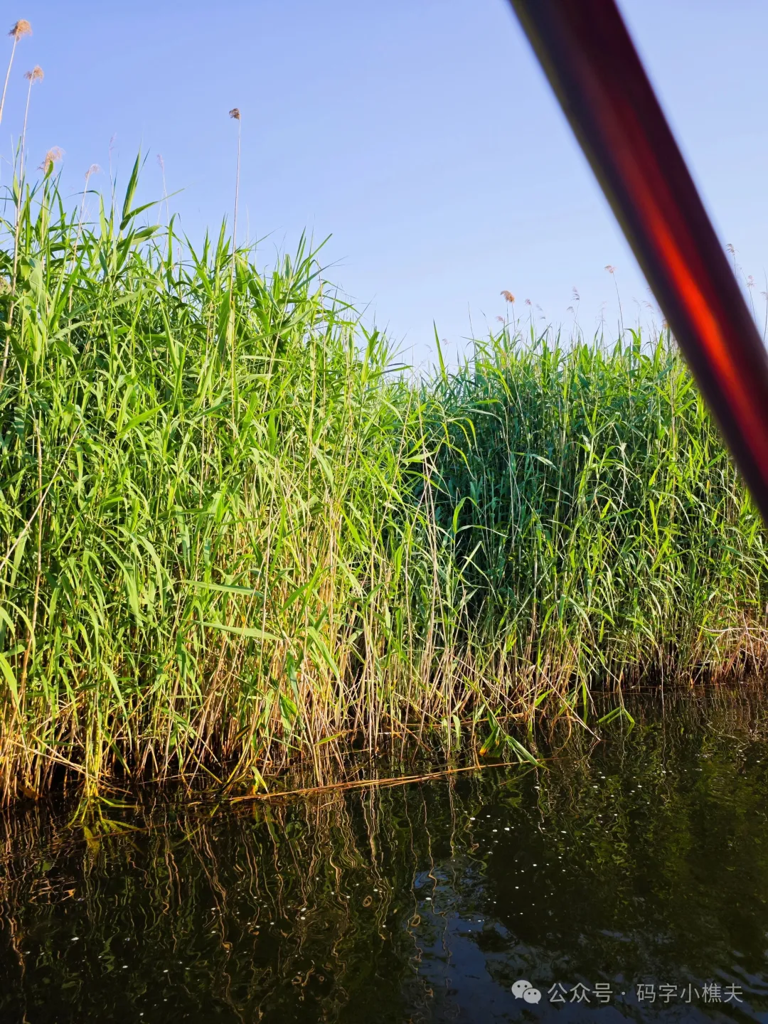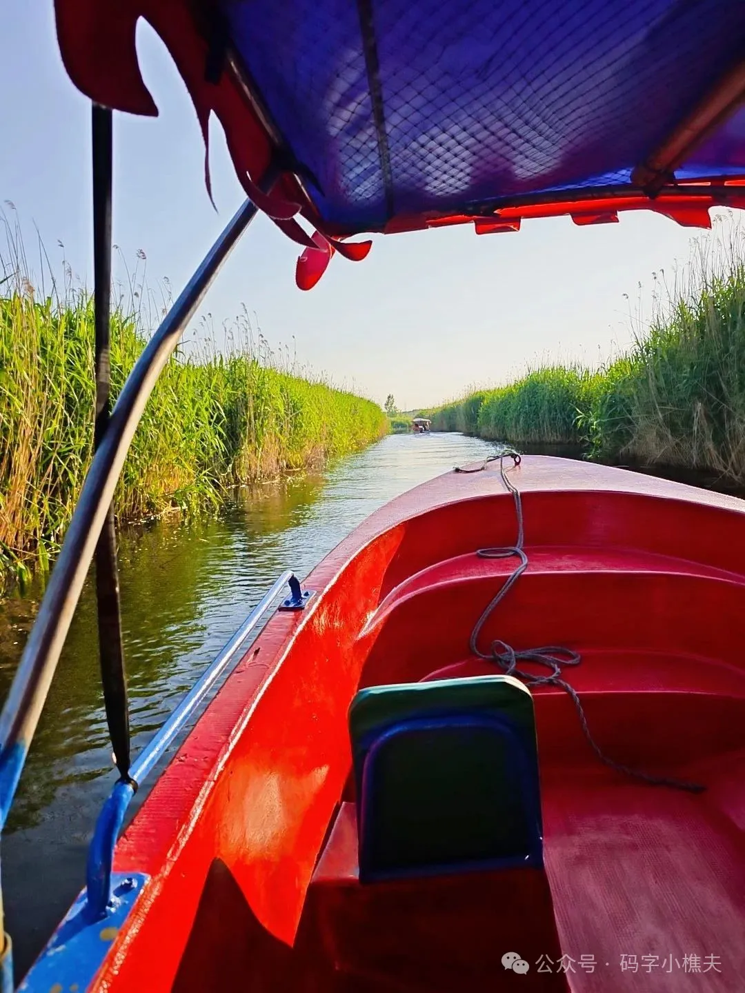 大哥说时间不早了,带我们穿梭一下芦苇荡。行进在芦苇荡里,才感觉是来白洋淀旅游了。小风一吹,欣赏片片绿色,还有悦耳的鸟叫声。水面波光粼粼,阳光散落在水面上,有点小意境。