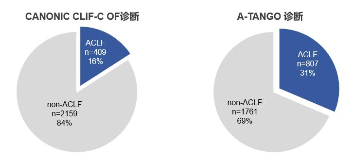 中国CATCH-LIFE队列2568例患者(乙型病毒性肝炎66%,酒精性肝病21%),A-TANGO诊断ACLF的占比为31%(CLIF-C OF 16%)。