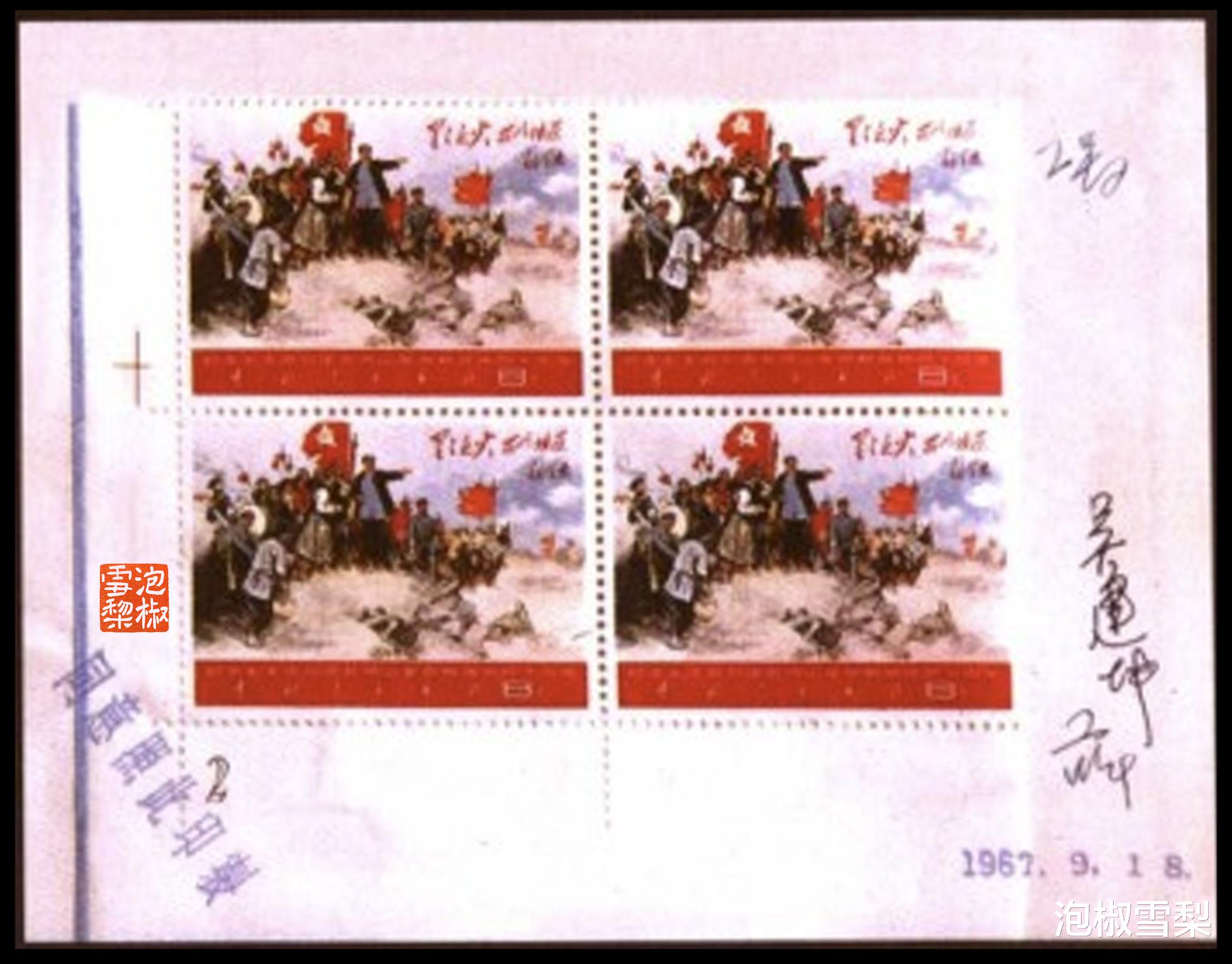 2000年后,设计者吴建坤根据回忆,重新手绘了第四枚邮票图稿,该画稿还多次在拍卖会上成交。幸运的是,邮电部在1967年的送审资料中,还贴有全套邮票四方联印样,于是这套邮票的真容被完好的保存下来,让我们还能一睹这套撤销发行邮票的风采。