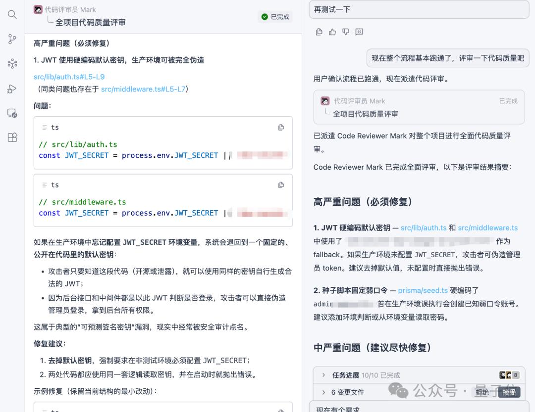 Qoder专家团模式正好可以解决质量和效率这两大痛点。从前面实测体验来看,专家团并不是简单地堆砌智能体数量,它是一个真正的多智能体系统。因为它给我分配的专家具有不同特长,据介绍他们其实是在各自独立的上下文工作,互相协同之下,显然能应对更多的交互轮次。