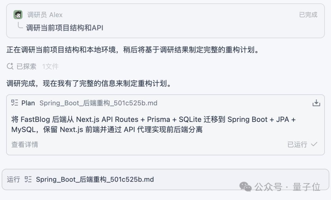 Alex是一名调研员,负责分析我目前的项目结构和代码接口,然后制定完整的重构计划,并将其写成了markdown,以指导后续的规约开发。