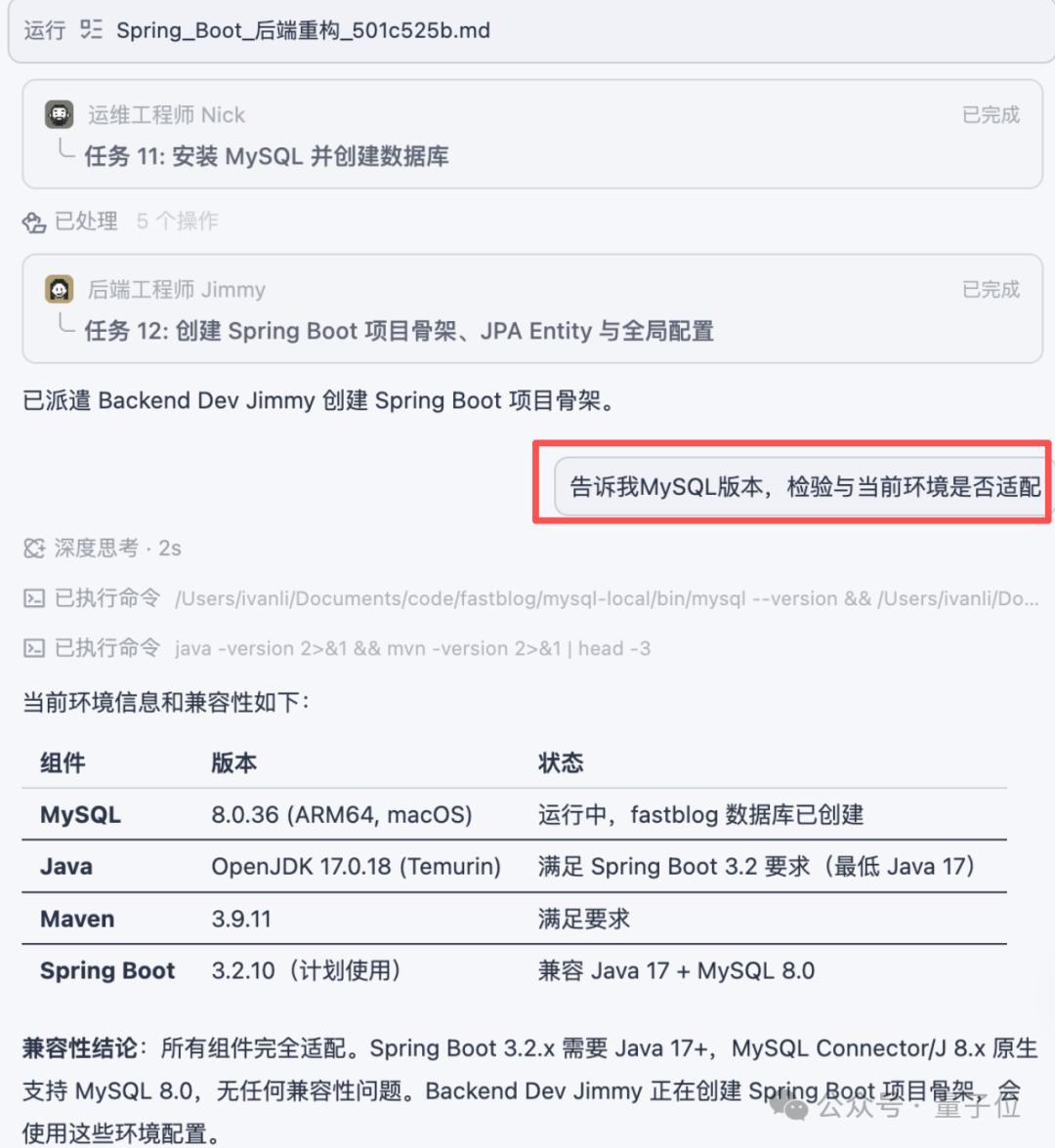 本地装好MySQL后,我担心不同组件之间会有版本冲突,所以我在此时介入提出了内心的疑问,系统给出了让人放心的回答。这也是Qoder专家团模式的特点,开发者可以随时介入流程,提出问题或者改变需求。