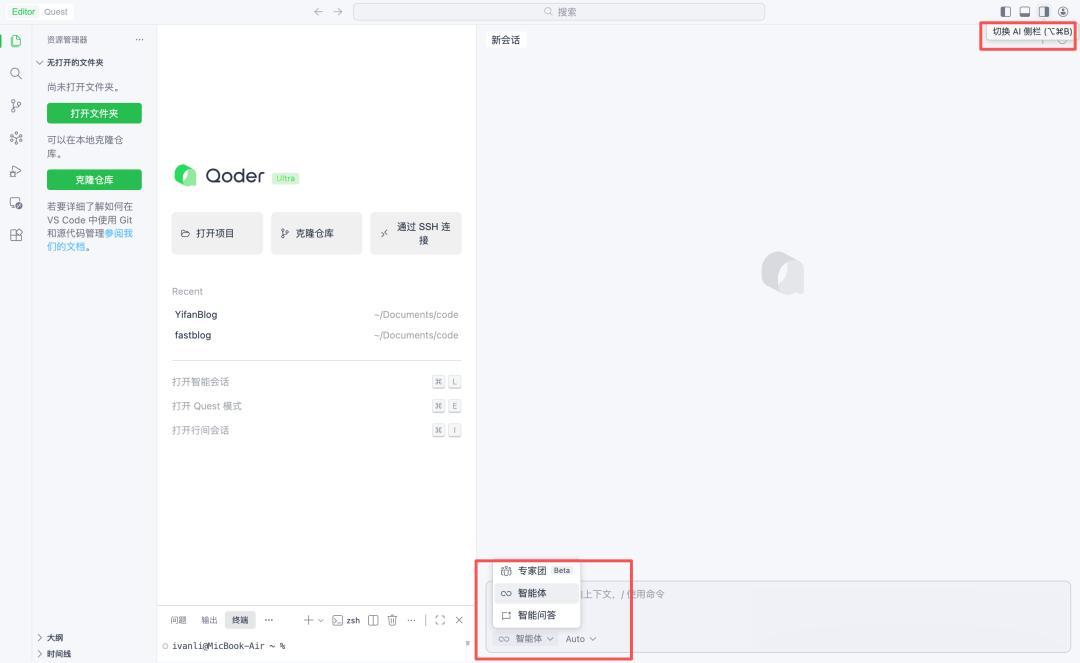 Qoder专家团带我速通个人博客打开Qoder后在Editor模式下,点击右上角“切换AI侧栏”,然后再点击中间下方切换模式按键,就能使用「专家团模式」 了。