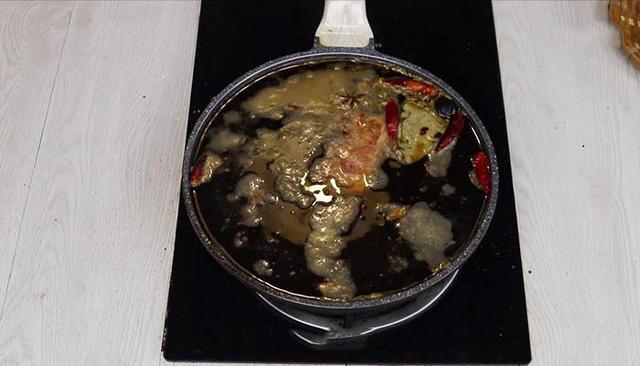 2、另起锅放入五花肉、八角、香叶、干辣椒、姜片、草果、茴香、甜面酱、黄豆酱、冰糖、盐、生抽、老抽,加清水没过食材,煮沸后,转中小火煮2小时;