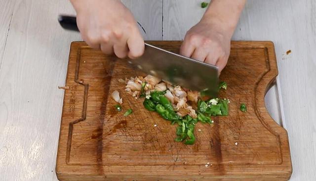 3、把五花肉捞出,剁碎,加入尖椒,一起剁碎;