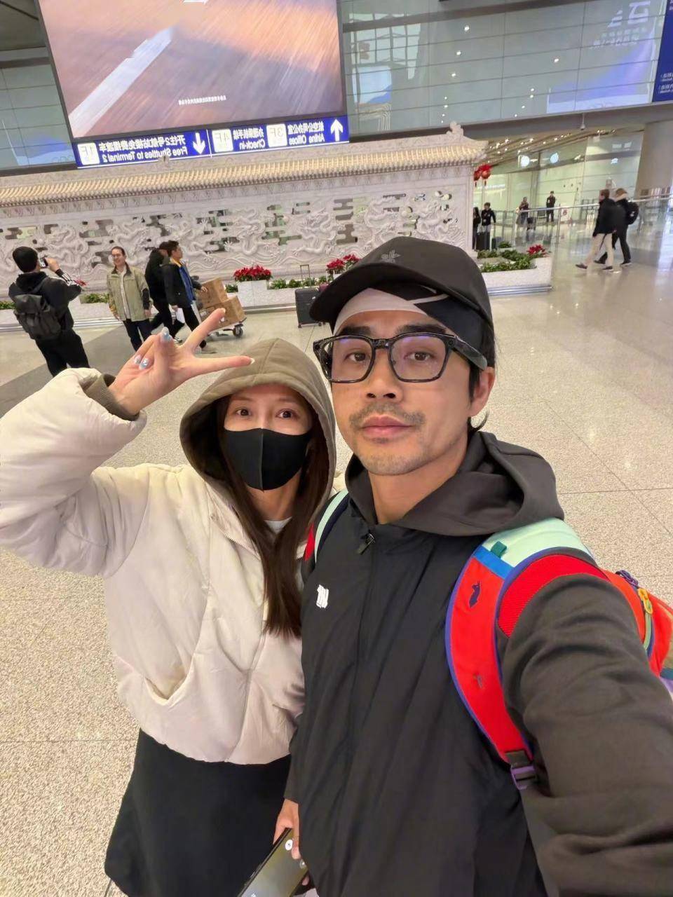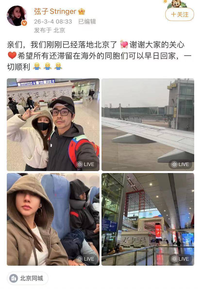 3月4日,全家人安全抵达北京,弦子发文报平安,夫妇合影展现劫后余生的欣慰与释然。