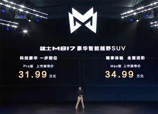 8月17日,猛士817正式上市,新车共推出2款车型,售价分别为31.99万元和34.99万元。同时,官方还送出包括升级礼、潮流礼、驾趣礼、智惠礼、金融礼、置换礼、用车无忧和服务无忧在内的八重上市首销专属权益,总价值超过7万元。