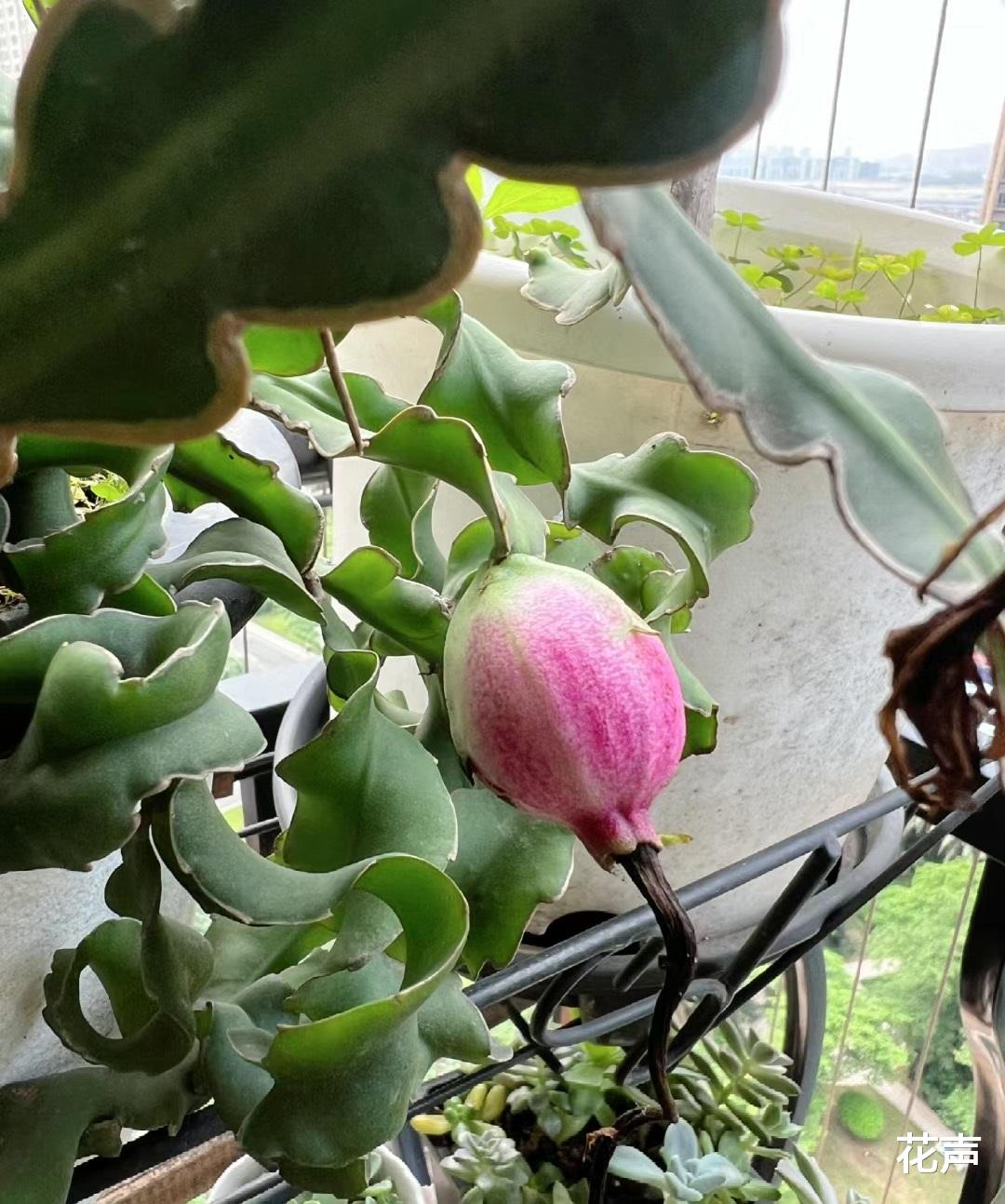 这种植物无需异株授粉,可以自花授粉,当花朵凋谢,会自己结果子,小果子刚长出来时是绿色的,逐渐成熟后变成红色,形状和火龙果很相似,果实内的果肉可以食用,味道微酸带甜,其实它和火龙果也是亲戚。果实里面有大量的种子,等它成熟后破开,把种子撒土里给点水,自己都能扎根生长,有时破开你会看到种子在里面都发芽了。