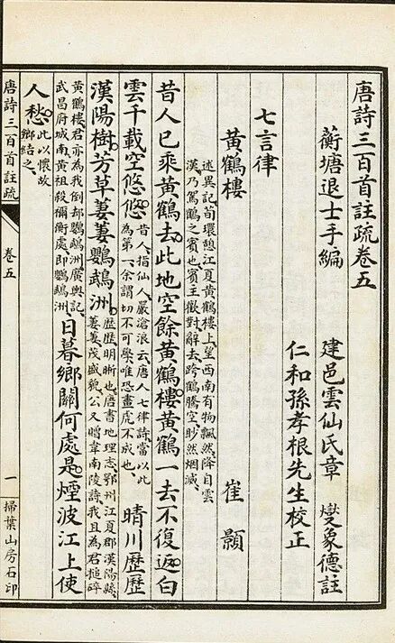 清代孙洙编选的《唐诗三百首》也将崔颢《黄鹤楼》放在“七言律诗”的首位。
