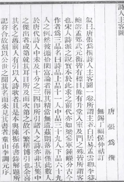 唐张为撰诗人主客图一卷,所谓主者,白居易、孟云卿、李益、鲍溶、孟郊、武元衡,皆有标目,余有升堂、入室及门之殊,皆所谓客也。宋人诗派之说,实本于此,求之前代,亦如梁参军钟嵘分古今作者为三品,名曰《诗品》,上品十一人,中品三十九人,下品六十九人之例。然彼捃拾闳富,论者称其精当无遗,兹则落仅此数人,于唐代诗人中未及十分之三四,即所引诸人之诗,亦非其集中之杰出者,或第就其耳目所及而次第之,故不繁称博引也(丁福保辑《历代诗话续编》,中华书局1983年版,页70)。