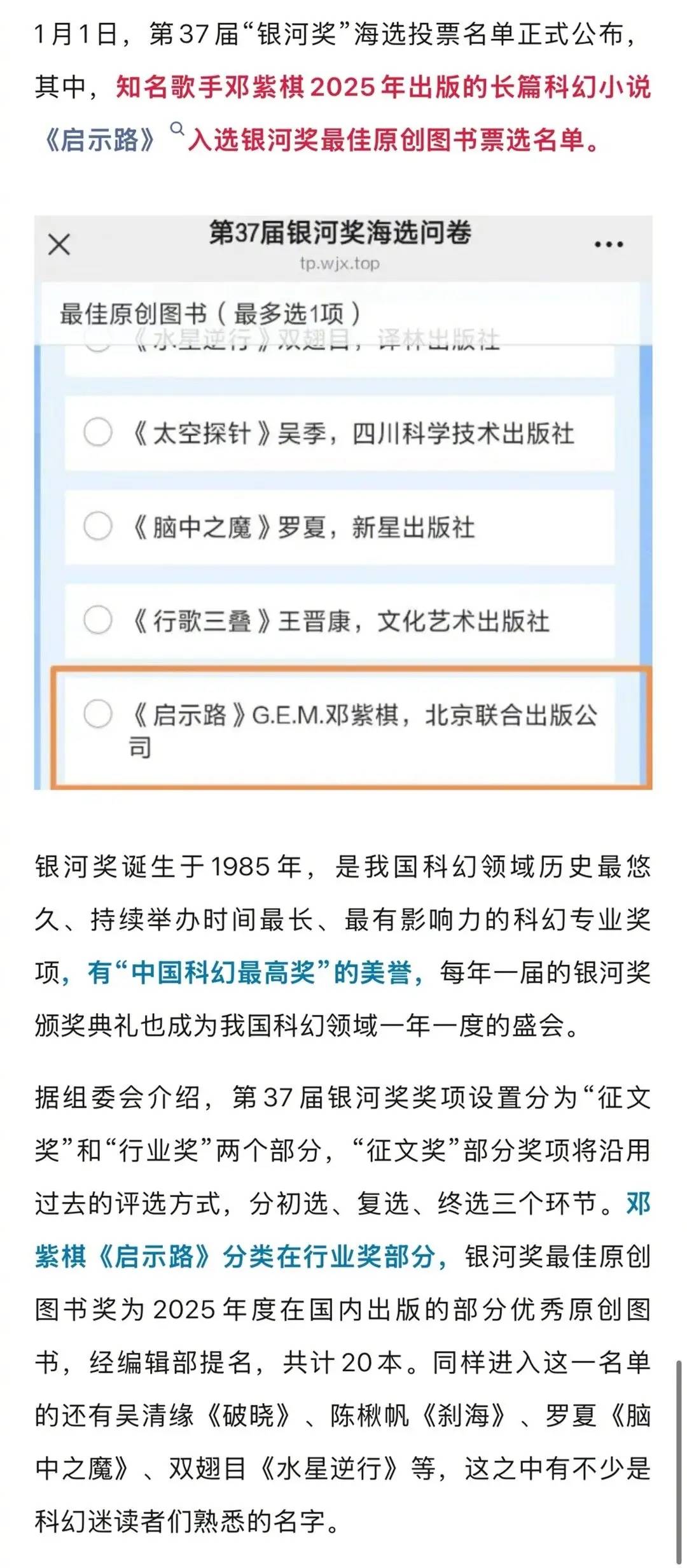 邓紫棋跨界写作炸翻热搜!1月4日她激动官宣科幻小说《启示路》入选银河奖,新人作家姿态难掩狂喜,结果组委会火速澄清“只是初选入选,非入围”,这场连环反转让网友直呼“太科幻了”!