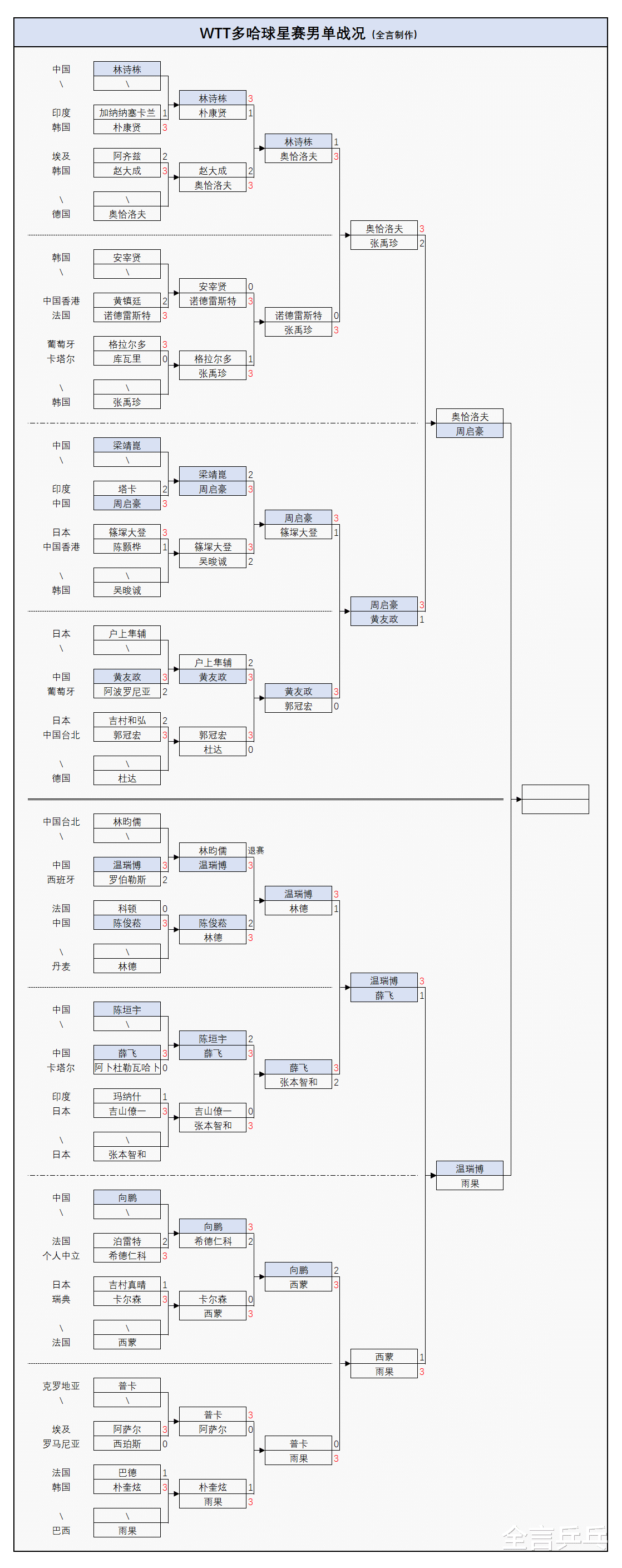 外协会方面,奥恰洛夫赢林诗栋入围8强,随后对决不久前同样打败过林诗栋的韩国主力张禹珍,巴西世界冠军雨果在经历了WTT多哈冠军赛一轮游后状态回升,不过一路没有遇到强敌,1/4决赛与法国老将西蒙展开较量。