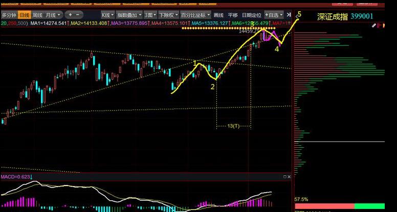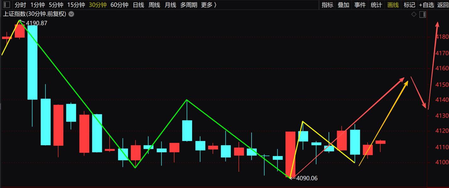 第二,从技术面分析。大盘目前已经走完了30分钟级别的“下—上—下”三笔结构,而从今天开始,正在运行的是30分钟级别的上涨第一笔。目前这一笔上涨只完成了次级别的“上—下”两笔,至少还需要再走一笔5分钟级别的上涨,之后才会进入30分钟级别的调整。如果再看深圳成指,目前它正处在某个推动浪的小4浪回调过程中。因此,本周的上半周理论上仍处于调整周期,不确定性相对较多,真正的安全期可能要到下半周才会到来。而今天的反弹,其实是以时间换空间的方式展开的,所以周三的时间窗口显得比较重要,大概率会形成一个阶段性的低点。