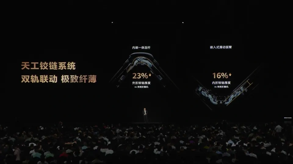 为带来更优秀好用的三折叠体验,华为Mate XTs 非凡大师还用上了新一代天工铰链和超形态三折叠屏技术。该铰链创新性引入内嵌设计,外折铰链搭配一体连杆结构,大幅降低铰链厚度,带来整机纤薄手感。内折铰链采用首创的嵌入式滑轨结构,减小弧路转动角度,使铰链厚度大幅减少。