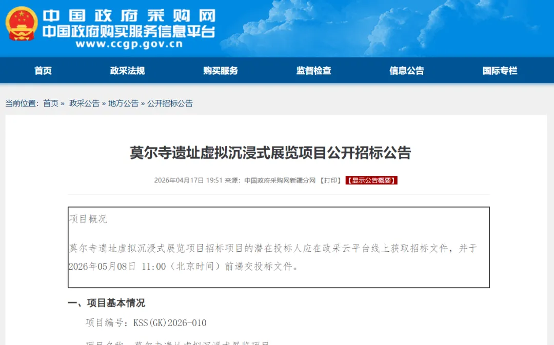 4月17日,中国政府采购网发布了莫尔寺遗址虚拟沉浸式展览项目的公开招标公告。